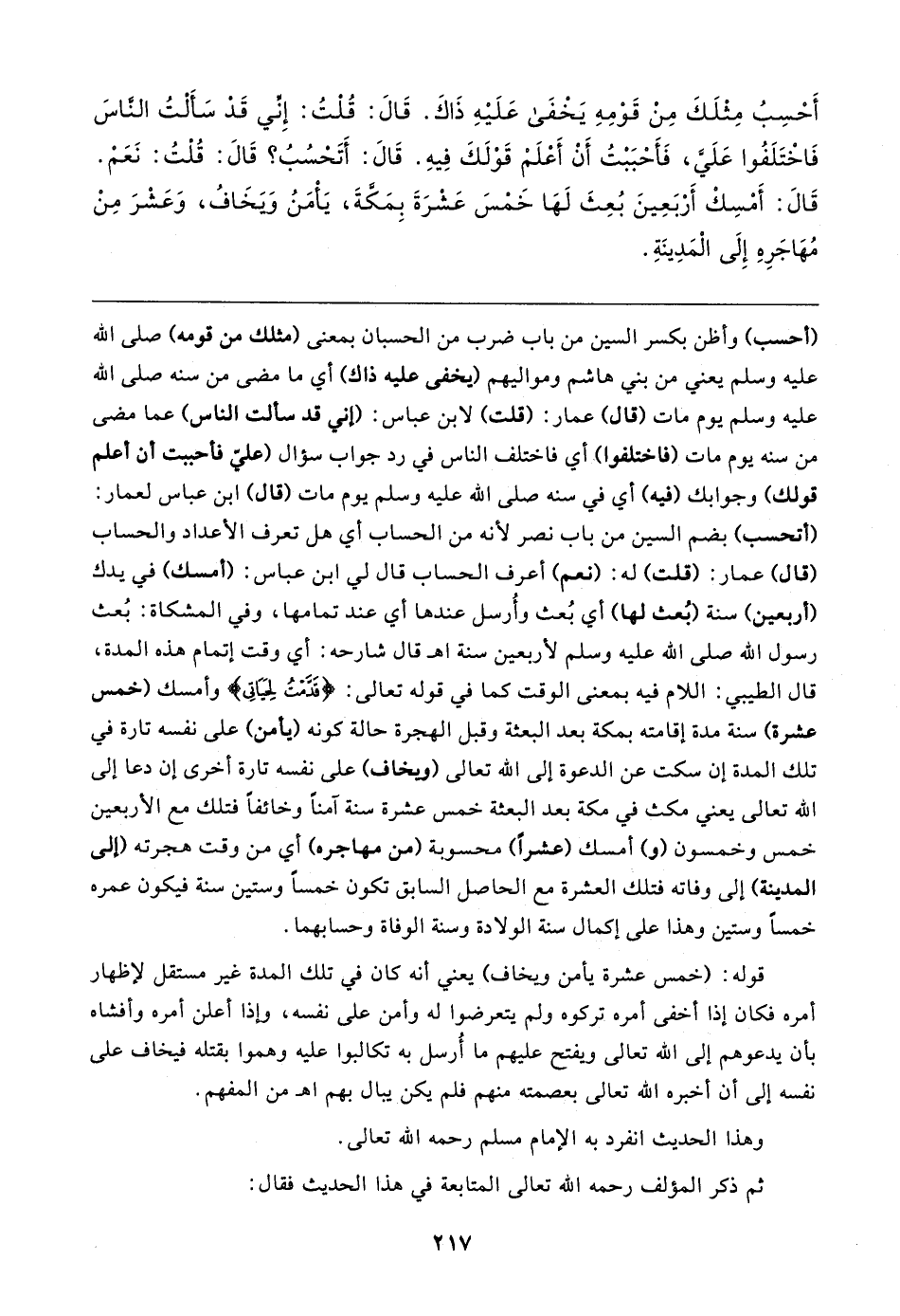 (أحسب) وأظن بكسر السين من باب ضرب من الحسبان بمعنى (مثلك من قومه) صلى الله عليه وسلم يعني من بني هاشم ومواليهم (يخفى عليه ذاك) أي ما مضى من سنه صلى الله عليه وسلم يوم مات (قال) عمار: (قلت) لابن عباس: (إني قد سألت الناس) عما مضى من سنه يوم مات (فاختلفوا) أي فاختلف الناس في رد جواب سؤال (عليّ فأحببت أن أعلم قولك) وجوابك (فيه) أي في سنه صلى الله عليه وسلم يوم مات (قال) ابن عباس لعمار: (أتحسب) بضم السين من باب نصر لأنه من الحساب أي هل تعرف الأعداد والحساب (قال) عمار: (قلت) له: (نعم) أعرف الحساب قال لي ابن عباس: (أمسك) في يدك (أربعين) سنة (بُعث لها) أي بُعث وأُرسل عندها أي عند تمامها، وفي المشكاة: بُعث رسول الله صلى الله عليه وسلم لأربعين سنة اهـ قال شارحه: أي وقت إتمام هذه المدة، قال الطيبي: اللام فيه بمعنى الوقت كما في قوله تعالى: {قَدَّمْتُ لِحَيَاتِي} وأمسك (خمس عشرة) سنة مدة إقامته بمكة بعد البعثة وقبل الهجرة حالة كونه (يأمن) على نفسه تارة في تلك المدة إن سكت عن الدعوة إلى الله تعالى (ويخاف) على نفسه تارة أخرى إن دعا إلى الله تعالى يعني مكث في مكة بعد البعثة خمس عشرة سنة آمنًا وخائفًا فتلك مع الأربعين خمس وخمسون (و) أمسك (عشرًا) محسوبة (من مهاجره) أي من وقت هجرته (إلى المدينة) إلى وفاته فتلك العشرة مع الحاصل السابق تكون خمسًا وستين سنة فيكون عمره خمسًا وستين وهذا على إكمال سنة الولادة وسنة الوفاة وحسابهما.