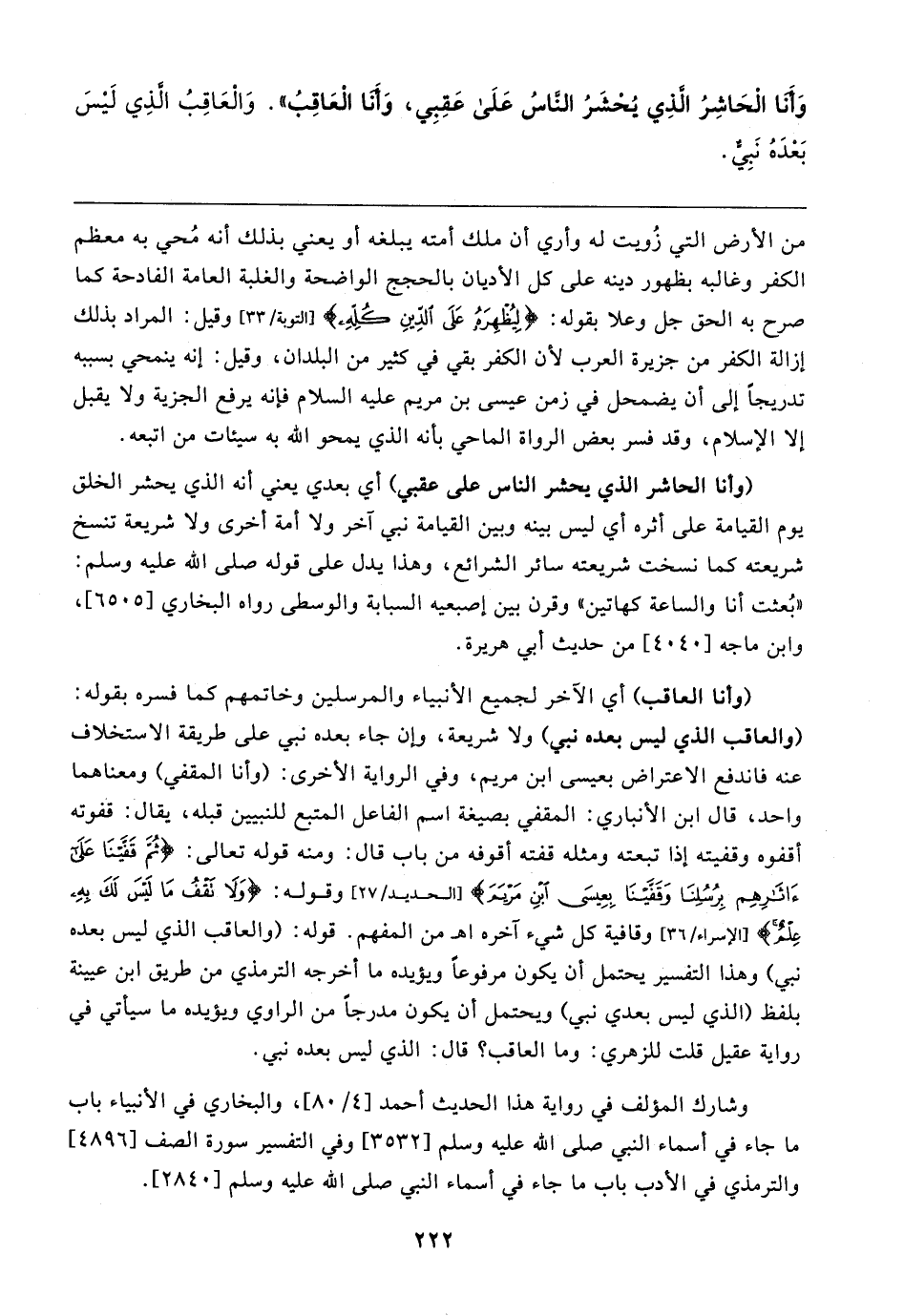 وَأنَا الْحَاشِرُ الَّذِي يُحْشَرُ النَّاسُ عَلَى عَقِبِي، وَأَنَا الْعَاقِبُ". وَالْعَاقِبُ الَّذِي لَيسَ بَعْدَهُ نَبِيٌّ