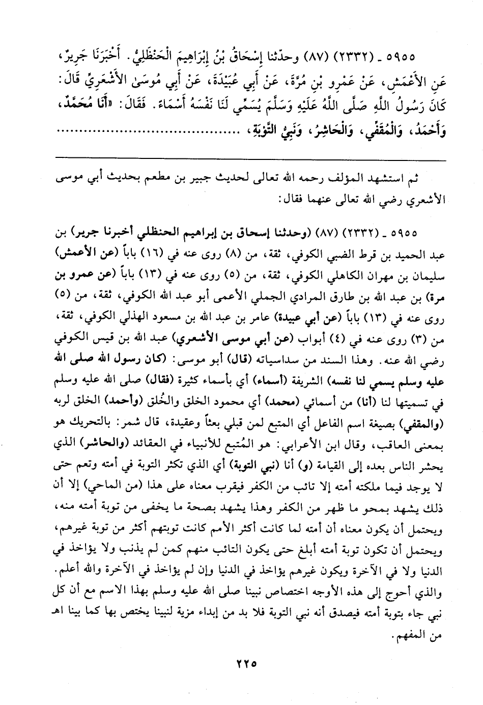 ٥٩٥٥ - (٢٣٣٢) (٨٧) وحدّثنا إِسْحَاقُ بْنُ إِبْرَاهِيمَ الْحَنْظَلِيُّ. أَخْبَرَنَا جَرِيرٌ، عَنِ الأعْمَشِ، عَنْ عَمْرِو بْنِ مُرَّةَ، عَنْ أَبِي عُبَيدَةَ، عَنْ أَبِي مُوسَى الأشْعَرِيِّ قَال: كَانَ رَسُولُ اللهِ صَلَّى اللهُ عَلَيهِ وَسَلَّمَ يُسَمِّي لَنَا نَفْسَهُ أَسْمَاءً. فَقَال: "أَنَا مُحَمَّدٌ، وَأَحْمَدُ، وَالْمُقَفِّي، وَالْحَاشِرُ، وَنَبِيُّ التَّوْبَةِ،