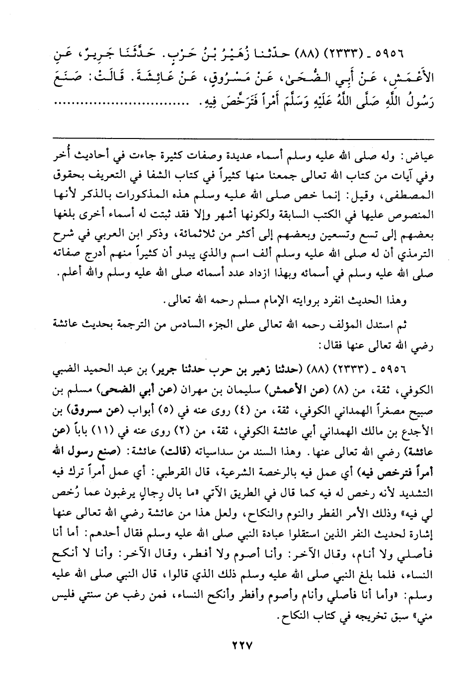 ٥٩٥٦ - (٢٣٣٣) (٨٨) (حدثنا زهير بن حرب حدثنا جرير) بن عبد الحميد الضبي الكوفي، ثقة، من (٨) (عن الأعمش) سليمان بن مهران (عن أبي الضحى) مسلم بن صبيح مصغرًا الهمداني الكوفي، ثقة، من (٤) روى عنه في (٥) أبواب (عن مسروق) بن الأجدع بن مالك الهمداني أبي عائشة الكوفي، ثقة، من (٢) روى عنه في (١١) بابا (عن عائشة) رضي الله تعالى عنها. وهذا السند من سداسياته (قالت) عائشة: (صنع رسول الله أمرًا فترخص فيه) أي عمل فيه بالرخصة الشرعية، قال القرطبي: أي عمل أمرًا ترك فيه التشديد لأنه رخص له فيه كما قال في الطريق الآتي "ما بال رِجالٍ يرغبون عما رُخص لي فيه" وذلك الأمر الفطر والنوم والنكاح، ولعل هذا من عائشة رضي الله تعالى عنها إشارة لحديث النفر الذين استقلوا عبادة النبي صلى الله عليه وسلم فقال أحدهم: أما أنا فأصلي ولا أنام، وقال الآخر: وأنا أصوم ولا أفطر، وقال الآخر: وأنا لا أنكح النساء، فلما بلغ النبي صلى الله عليه وسلم ذلك الذي قالوا، قال النبي صلى الله عليه وسلم: "وأما أنا فأصلي وأنام وأصوم وأفطر وأنكح النساء، فمن رغب عن سنتي فليس مني" سبق تخريجه في كتاب النكاح.