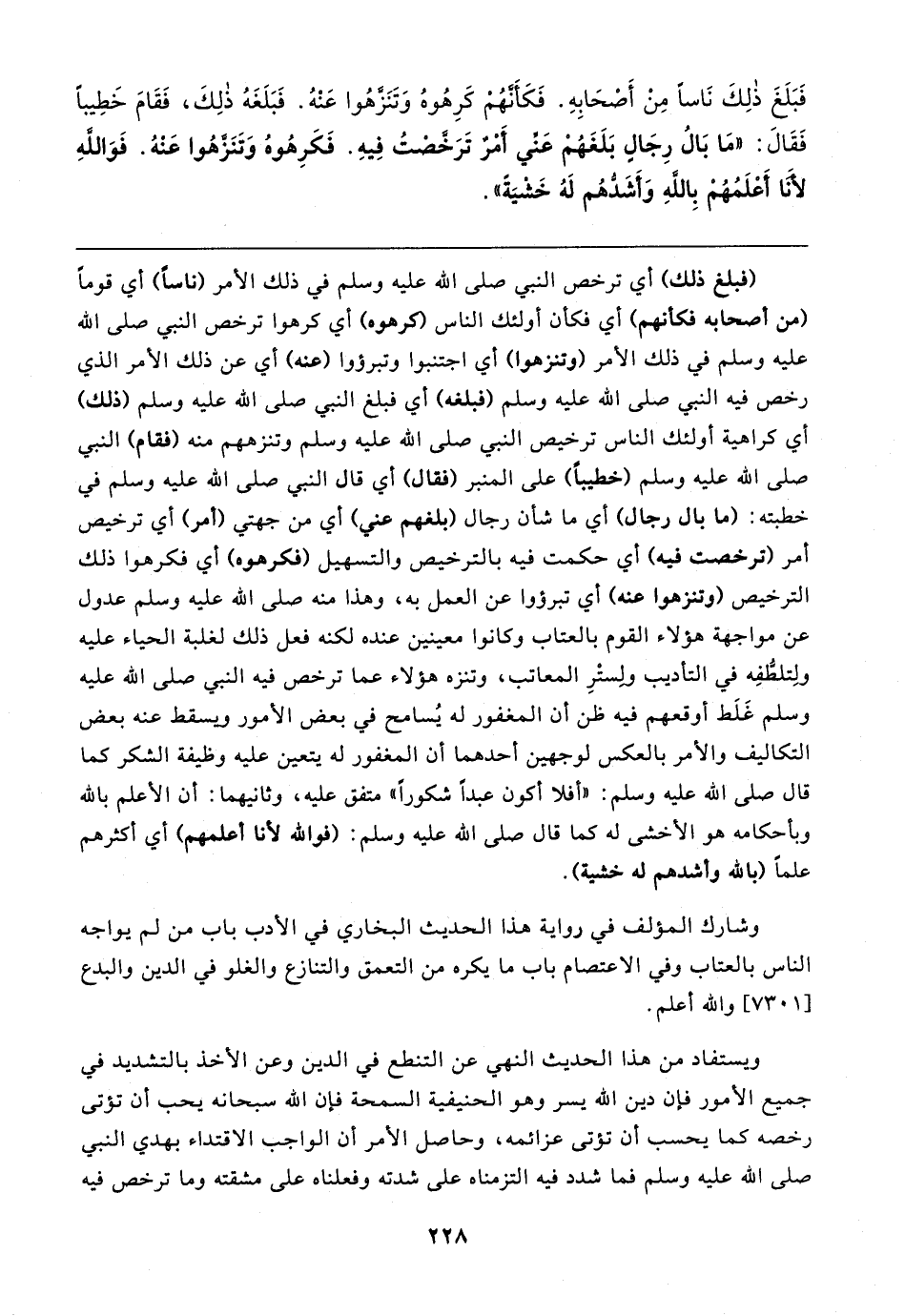فَبَلَغَ ذلِكَ نَاسًا مِنْ أَصْحَابِهِ. فَكَأَنَّهُمْ كَرِهُوهُ وَتَنَزَّهُوا عَنْهُ. فَبَلَغَهُ ذلِكَ، فَقَامَ خَطِيبًا فَقَال: "مَا بَالُ رِجَالٍ بَلَغَهُمْ عَنِّي أَمْرٌ تَرَخَّصْتُ فِيهِ. فَكَرِهُوهُ وَتَنَزَّهُوا عَنْهُ. فَوَاللهِ لَأنَا أَعْلَمُهُمْ بِاللهِ وَأَشَدُّهُم لَهُ خَشْيَةً"