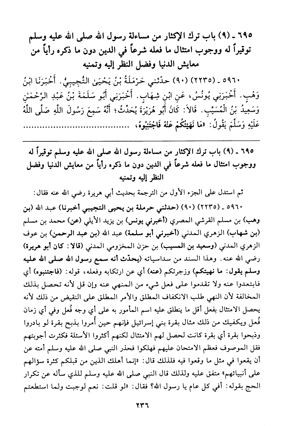 ٥٩٦٠ - (٢٢٣٥) (٩٠) حدّثني حَرْمَلَةُ بْنُ يَحْيَى التُّجِيبِيُّ. أَخْبَرَنَا ابْنُ وَهْبٍ. أَخْبَرَنِي يُونُسُ، عَنِ ابْنِ شِهَابٍ. أَخْبَرَنِي أَبُو سَلَمَةَ بْنُ عَبْدِ الرَّحْمَنِ وَسَعِيدُ بْنُ الْمُسَيَّبِ. قَالا: كَانَ أَبُو هُرَيرَةَ يُحَدِّثُ؛ أَنَّهُ سَمِعَ رَسُولَ اللهِ صَلَّى اللهُ عَلَيهِ وَسَلَّمَ يَقُولُ: "مَا نَهَيتُكُمْ عَنْهُ فَاجْتَنِبُوهُ،