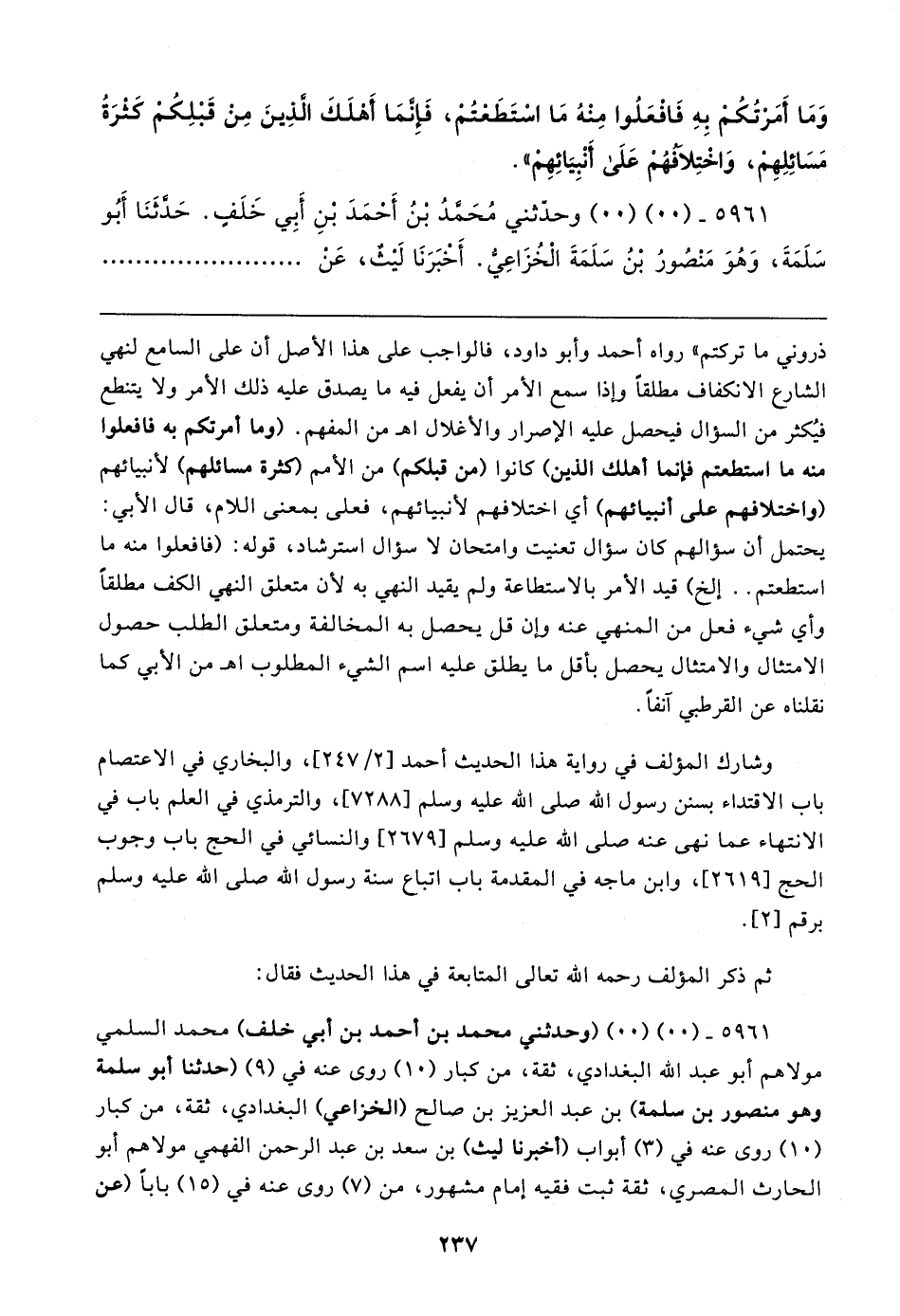 وَمَا أَمَرْتُكُمْ بِهِ فَافْعَلُوا مِنْهُ مَا اسْتَطَعْتُمْ، فَإنَّمَا أَهْلَكَ الَّذِينَ مِنْ قَبْلِكُمْ كَثْرَةُ مَسَائِلِهِمْ، وَاخْتِلافُهُمْ عَلَى أَنْبِيَائِهِمْ".