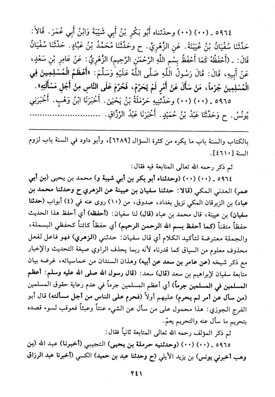 ٥٩٦٤ - (٠٠) (٠٠) وحدّثناه أَبُو بَكْرِ بْنُ أَبِي شَيبَةَ وَابْنُ أَبِي عُمَرَ. قَالا: حَدَّثَنَا سُفْيَانُ بْنُ عُيَينَةَ. عَنِ الزُّهْرِيِّ. ح وحَدَّثَنَا مُحَمَّدُ بْنُ عَبَّادٍ. حَدَّثَنَا سُفْيَانُ قَال: - (أحْفَظُهُ كَمَا أَحْفَظُ بِسْمِ اللهِ الرَّحْمَنِ الرَّحِيمِ) الزُّهْرِيُّ: عَنْ عَامِرِ بْنِ سَعْدٍ، عَنْ أَبِيهِ، قَال: قَال رَسُولُ اللهِ صَلَّى اللهُ عَلَيهِ وَسَلَّمَ: "أَعْظَمُ الْمُسْلِمِينَ فِي الْمُسْلِمِينَ جُرْمًا، مَنْ سَأَلَ عَنْ أَمْرٍ لَمْ يُحَرَّمْ، فَحُرِّمَ عَلَى النَّاسِ مِنْ أَجْلِ مَسْأَلَتِهِ".