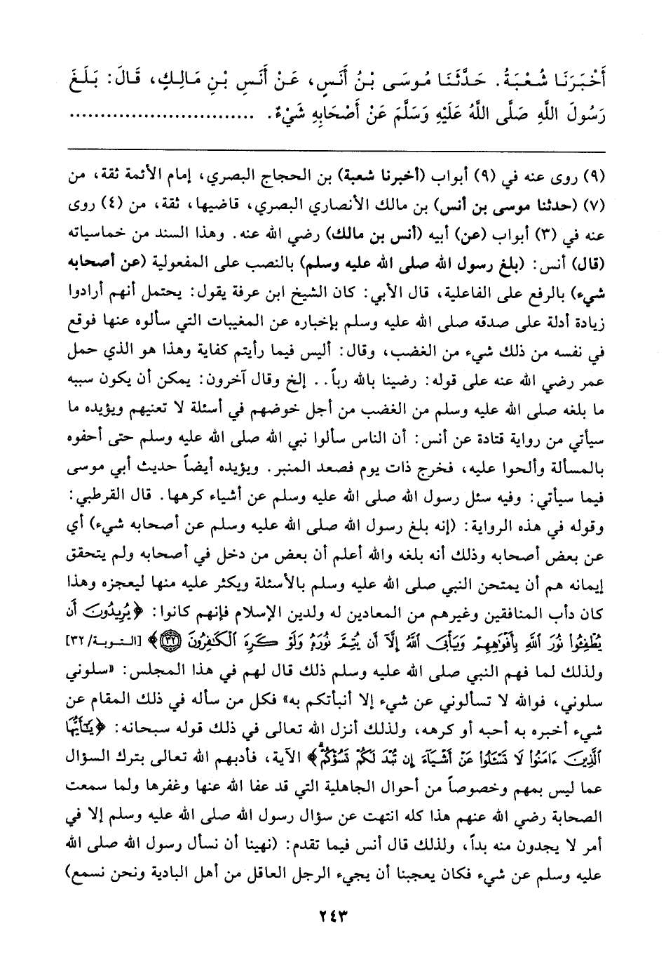 (٩) روى عنه في (٩) أبواب (أخبرنا شعبة) بن الحجاج البصري، إمام الأئمة ثقة، من (٧) (حدثنا موسى بن أنس) بن مالك الأنصاري البصري، قاضيها، ثقة، من (٤) روى عنه في (٣) أبواب (عن) أبيه (أنس بن مالك) رضي الله عنه. وهذا السند من خماسياته (قال) أنس: (بلغ رسول الله صلى الله عليه وسلم) بالنصب على المفعولية (عن أصحابه شيء) بالرفع على الفاعلية، قال الأبي: كان الشيخ ابن عرفة يقول: يحتمل أنهم أرادوا زيادة أدلة على صدقه صلى الله عليه وسلم بإخباره عن المغيبات التي سألوه عنها فوقع في نفسه من ذلك شيء من الغضب، وقال: أليس فيما رأيتم كفاية وهذا هو الذي حمل عمر رضي الله عنه على قوله: رضينا بالله ربًا .. إلخ وقال آخرون: يمكن أن يكون سببه ما بلغه صلى الله عليه وسلم من الغضب من أجل خوضهم في أسئلة لا تعنيهم ويؤيده ما سيأتي من رواية قتادة عن أنس: أن الناس سألوا نبي الله صلى الله عليه وسلم حتى أحفوه بالمسألة وألحوا عليه، فخرج ذات يوم فصعد المنبر. ويؤيده أيضًا حديث أبي موسى فيما سيأتي: وفيه سئل رسول الله صلى الله عليه وسلم عن أشياء كرهها. قال القرطبي: وقوله في هذه الرواية: (إنه بلغ رسول الله صلى الله عليه وسلم عن أصحابه شيء) أي عن بعض أصحابه وذلك أنه بلغه والله أعلم أن بعض من دخل في أصحابه ولم يتحقق إيمانه هم أن يمتحن النبي صلى الله عليه وسلم بالأسئلة ويكثر عليه منها ليعجزه وهذا كان دأب المنافقين وغيرهم من المعادين له ولدين الإسلام فإنهم كانوا: {يُرِيدُونَ أَنْ يُطْفِئُوا نُورَ اللَّهِ بِأَفْوَاهِهِمْ وَيَأْبَى اللَّهُ إلا أَنْ يُتِمَّ نُورَهُ وَلَوْ كَرِهَ الْكَافِرُونَ (٣٢)} [التوبة: ٣٢] ولذلك لما فهم النبي صلى الله عليه وسلم ذلك قال لهم في هذا المجلس: "سلوني سلوني، فوالله لا تسألوني عن شيء إلا أنبأتكم به" فكل من سأله في ذلك المقام عن شيء أخبره به أحبه أو كرهه، ولذلك أنزل الله تعالى في ذلك قوله سبحانه: {يَا أَيُّهَا الَّذِينَ آمَنُوا لَا تَسْأَلُوا عَنْ أَشْيَاءَ إِنْ تُبْدَ لَكُمْ تَسُؤْكُمْ} الآية، فأدبهم الله تعالى بترك السؤال عما ليس بمهم وخصوصًا من أحوال الجاهلية التي قد عفا الله عنها وغفرها ولما سمعت الصحابة رضي الله عنهم هذا كله انتهت عن سؤال رسول الله صلى الله عليه وسلم إلا في أمر لا يجدون منه بدًا، ولذلك قال أنس فيما تقدم: (نهينا أن نسأل رسول الله صلى الله عليه وسلم عن شيء فكان يعجبنا أن يجيء الرجل العاقل من أهل البادية ونحن نسمع)