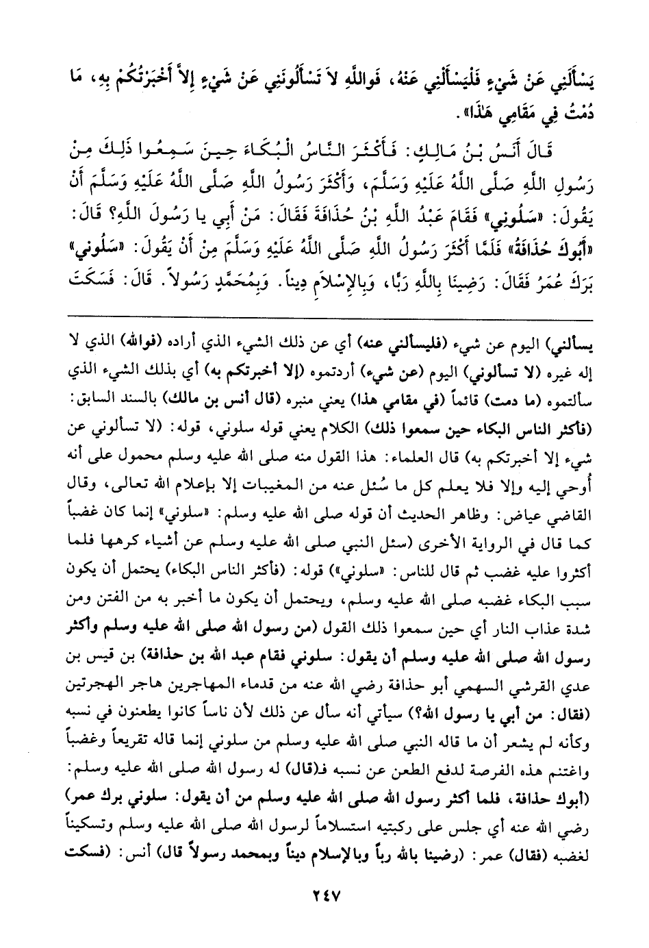 قَال أنسُ بْنُ مَالِكٍ: فَأكْثَرَ الناسُ الْبُكَاءَ حِينَ سَمِعُوا ذَلِكَ مِنْ رَسُولِ الله صلى الله عَلَيهِ وَسَلمَ، وَأَكْثَرَ رَسُولُ الله صلى الله عَلَيهِ وَسَلمَ أَنْ يَقُولَ: "سَلُوني" فَقَامَ عَبدُ الله بْنُ حُذَافَةَ فَقَال: مَنْ أَبِي يا رَسُولَ الله؟ قَال: "أبوكَ حُذَافَةُ" فَلَما أَكْثَرَ رَسُولُ الله صلى الله عَلَيهِ وَسَلمَ مِنْ أَنْ يَقُولَ: "سَلُوني" بَرَكَ عُمَرُ فَقَال: رَضِينَا بِاللهِ رَبا، وَبِالإِسْلامِ دِينا. وَبِمُحَمدٍ رَسُولًا. قَال: فَسَكَتَ