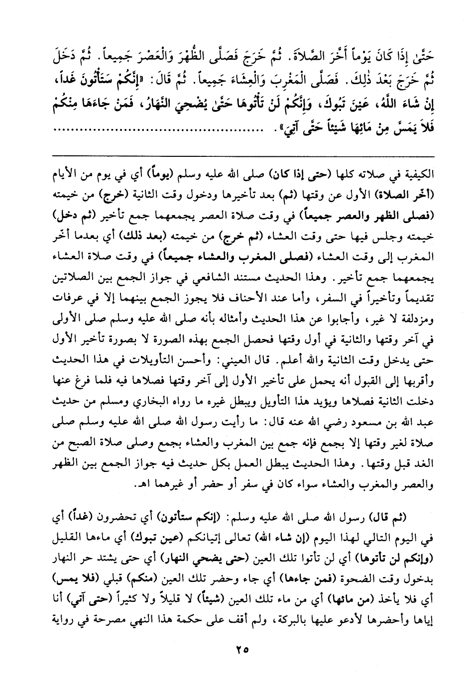 حَتَّى إِذَا كَانَ يَوْمًا أَخَّرَ الصَّلاةَ. ثُمَّ خَرَجَ فَصَلَّى الظُّهْرَ وَالْعَصْرَ جَمِيعًا. ثُمَّ دَخَلَ ثُمَّ خَرَجَ بَعْدَ ذلِكَ. فَصَلَّى الْمَغْرِبَ وَالْعِشَاءَ جَمِيعًا. ثُمَّ قَال: "إِنَّكُمْ سَتَأْتُونَ غَدًا، إِنْ شَاءَ اللهُ، عَينَ تَبُوكَ، وَإِنَّكُمْ لَنْ تَأْتُوهَا حَتَّى يُضْحِيَ النَّهَارُ، فَمَنْ جَاءَهَا مِنْكُمْ فَلَا يَمَسَّ مِن مَائِهَا شيئًا حَتَّى آتِيَ"
