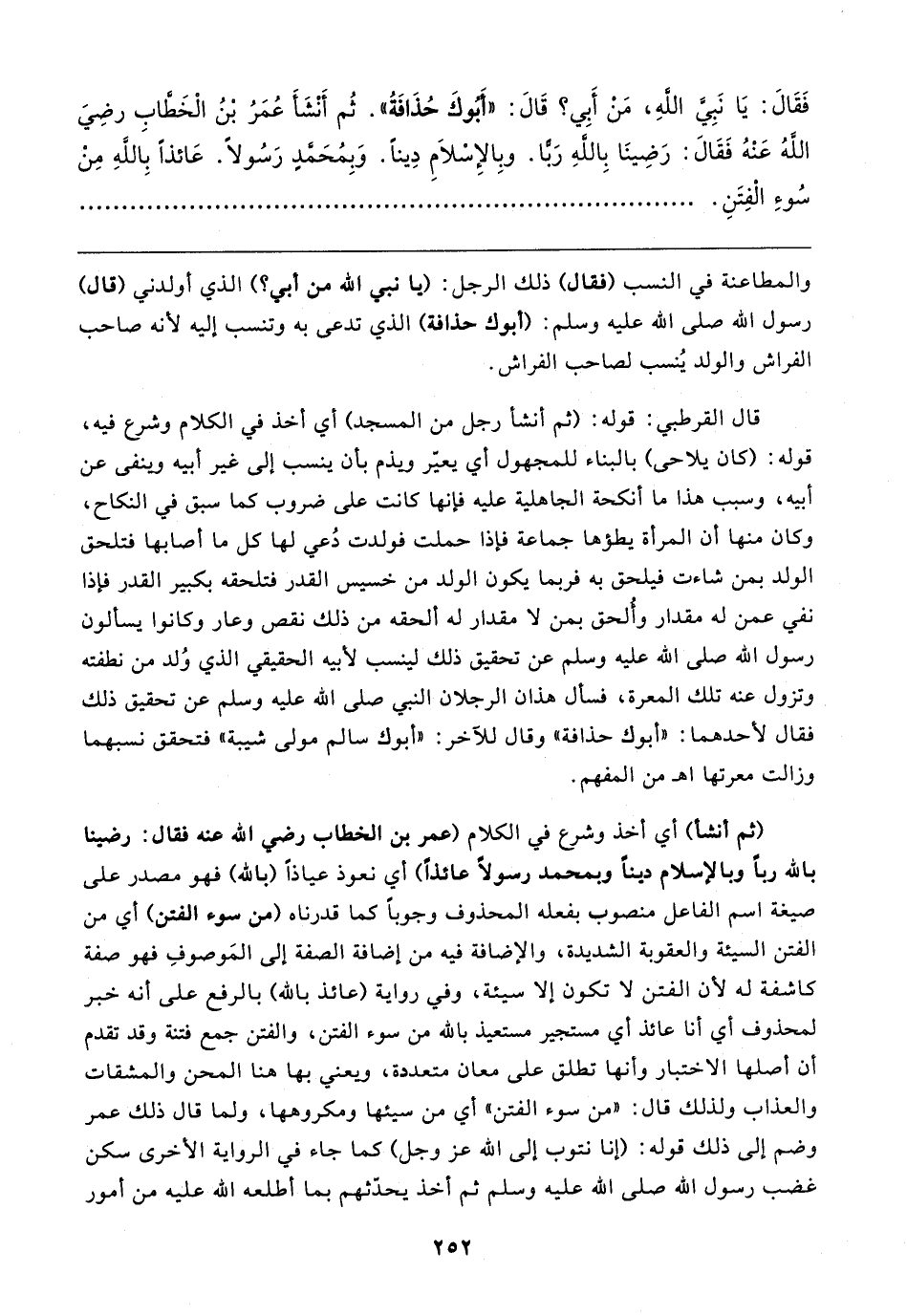 فَقَال: يَا نَبِي الله، مَنْ أَبِي؟ قَال: "أبوكَ حُذَافَةُ". ثُم أنْشَأ عُمَرُ بْنُ الْخَطابِ رضِيَ اللهُ عَنْهُ فَقَال: رَضِينَا بِاللهِ رَبا. وبِالإِسْلامِ دِينا. وَبِمُحَمدٍ رَسُولا. عَائذا بِاللهِ مِنْ سُوءِ الْفِتَنِ