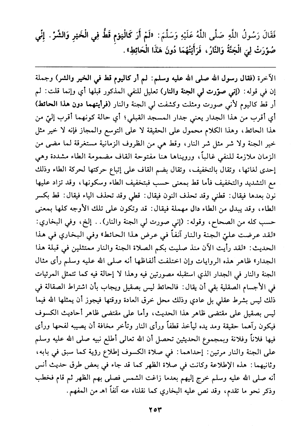 الآخرة (فقال رسول الله صلى الله عليه وسلم: لم أر كاليوم قط في الخير والشر) وجملة إن في قوله: (إني صررت لي الجنة والنار) تعليل للنفي المذكور قبلها أي وإنما قلت: لم أو قط كاليوم لأني صورت ومثلت وكشفت لي الجنة والنار (فرأيتهما دون هذا الحائط) أي أقرب من هذا الجدار يعني جدار المسجد القبلي؛ أي حالة كونهما أقرب إيئ من هذا الحائط، وهذا الكلام محمول على الحقيقة لا على التوسع والمجاز فإنه لا خير مثل خير الجنة ولا شر مثل شر النار، وقط هي من الظروف الزمانية مستغرقة لما مضى من الزمان ملازمة للنفي غالبا، ورويناها هنا مفتوحة القاف مضمومة الطاء مشددة وهي إحدى لغاتها، وتقال بالتخفيف، وتقال بضم القاف على إتباع حركتها لحركة الطاء وذلك مع التشديد والتخفيف فأما قط بمعنى حسب فبتخفيف الطاء وسكونها، وقد تزاد عليها نون بعدها فيقال: قطني وقد تحذف النون فيقال: قطي وقد تحذف الياء فيقال: قط بكسر الطاء، وقد يبدل من الطاء دال مهملة فيقال: قد وتكون على تلك الأوجه كلها بمعنى حسب كله من الصحاح، وقوله: (إني صورت لي الجنة والنار) .. إلخ، وفي البخاري: "لقد عرضت علي الجنة والنار آنفا في عرض هذا الحائط" وفي البخاري في هذا الحديث: "لقد رأيت الآن منذ صليت بكم الصلاة الجنة والنار ممتثلين في قبلة هذا الجدار" ظاهر هذه الروايات وإن اختلفت ألفاظها أنه صلى الله عليه وسلم رأى مثال الجنة والنار في الجدار الذي استقبله مصورتين فيه وهذا لا إحالة فيه كما تتمثل المرئيات في الأجسام الصقلية بقي أن يقال: فالحائط ليس بصقيل ويجاب بأن اشتراط الصقالة في ذلك ليس بشرط عقلي بل عادي وذلك محل خرق العادة ووقتها فيجوز أن يمثلها الله فيما ليس بصقيل على مقتضى ظاهر هذا الحديث، وأما على مقتضى ظاهر أحاديث الكسوف فيكون رآهما حقيقة ومد يده لياخذ قطفا ورأى النار وتأخر مخافة أن يصيبه لفحها ورأى فيها فلانا وفلانة وبمجموع الحديثين تحصل أن الله تعالى أطلع نبيه صلى الله عليه وسلم على الجنة والنار مرتين: إحداهما: في صلاة الكسوت إطلاع رؤية كما سبق في بابه، وثانيهما: هذه الإطلاعة وكانت في صلاة الظهر كما قد جاء في بعض طرق حديث أنس أنه صلى الله عليه وسلم خرج إليهم بعدما زاغت الشمس فصلى بهم الظهر ثم قام فخطب وذكر نحو ما تقدم، وقد نص عليه البخاري كما نقلناه عنه آنفا اهـ من المفهم.