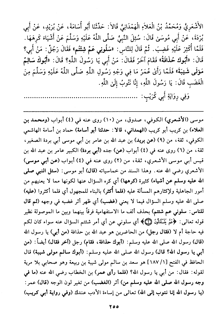 الأشعَرِي وَمُحَمدُ بْنُ الْعَلاءِ الْهَمدَانِي قَالا: حَدَّثَنَا أَبُو أسَامَةَ، عَنْ بُرَيدٍ، عَن أَبِي بُرْدَةَ، عَنْ أبِي مُوسَي قَال: سُئِلَ النَّبِيّ صلى اللهُ عَلَيهِ وَسَلمَ عَنْ أَشْيَاءَ كَرِهَهَا. فَلَمَّا أُكْثِرَ عَلَيهِ غَضِبَ. ثُم قَال لِلناسِ: "سَلُوني عَم شِئْتُم لا فَقَال رَجُل: مَنْ أبِي؟ قَال: "أَبُوك حُذَافَةُ" فَقَامَ آخَرُ فَقَال: مَنْ أَبِي يَا رَسُولَ الله؟ قَال: "أَبوكَ سَالِم مَوْلَى شَيبَةَ" فَلَما رَأَي عُمَرُ مَا فِي وَجْهِ رَسُولِ الله صلى الله عَلَيهِ وَسَلمَ مِنَ الْغَضَبِ قَال: يَا رَسُولَ الله، إِنا نَتُوبُ إِلَي الله.