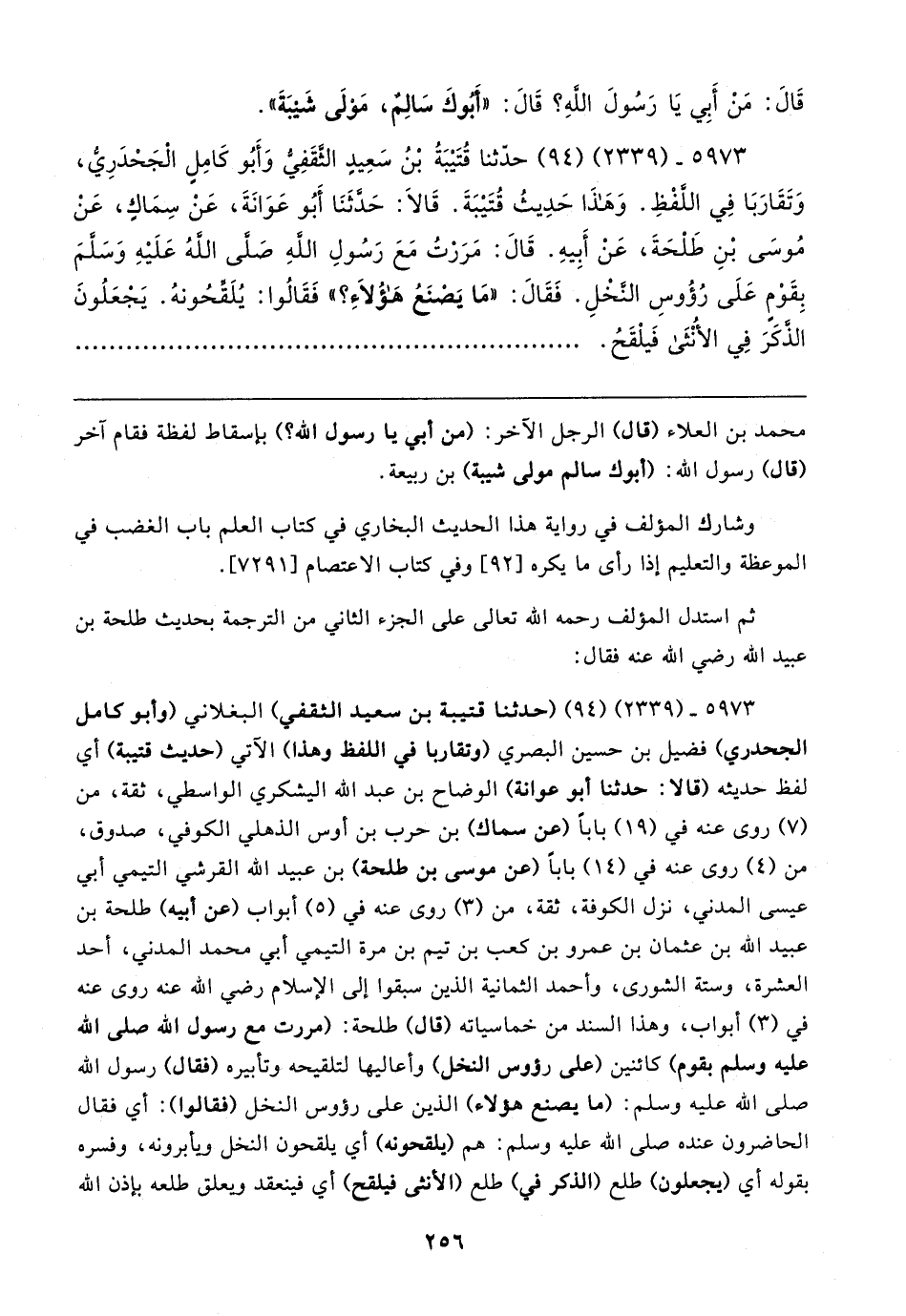 ٥٩٧٣ - (٢٣٣٩) (٩٤) (حدثنا قتيبة بن سعيد الثقفي) البغلاني (وأبو كامل الجحدري) فضيل بن حسين البصري (وتقاربا في اللفظ وهذا) الآتي (حديث قتيبة) أي لفظ حديثه (قالا: حدثنا أبو عوانة) الوضاح بن عبد الله اليشكري الواسطي، ثقة، من (٧) روى عنه في (١٩) بابا (عن سماك) بن حرب بن أوس الذهلي الكوفي، صدوق، من (٤) روى عنه في (١٤) بابا (عن موسى بن طلحة) بن عبيد الله القرشي التيمي أبي عيسى المدني، نزل الكوفة، ثقة، من (٣) روى عنه في (٥) أبواب (عن أبيه) طلحة بن عبيد الله بن عثمان بن عمرو بن كعب بن تيم بن مرة التيمي أبي محمد المدني، أحد العشرة، وستة الشورى، وأحمد الثمانية الذين سبقوا إلى الإسلام رضي الله عنه روى عنه في (٣) أبواب، وهذا السند من خماسياته (قال) طلحة: (مررت مع رسول الله صلى الله عليه وسلم بقوم) كائنين (على رؤوس النخل) وأعاليها لتلقيحه وتأبيره (فقال) رسول الله صلى الله عليه وسلم: (ما يصنع هولاء) الذين على رؤوس النخل (فقالوا): أي فقال الحاضرون عنده صلى الله عليه وسلم: هم (يلقحونه) أي يلقحون النخل ويأبرونه، وفسره بقوله أي (يجعلون) طلع (الذكر في) طلع (الأنثى فيلقح) أي فينعقد ويعلق طلعه بإذن الله