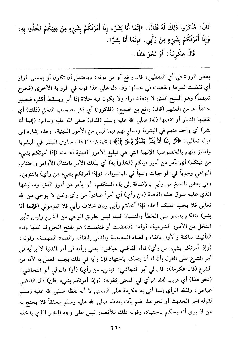 بعض الرواة في أي اللفظين، قال رافع أو من دونه: ويحتمل أن تكون أو بمعنى الواو أي نفضت ثمرها ونقصت في حملها وقد دل على هذا قوله في الرواية الأخرى (فخرج شيصًا) وهو البلح الذي لا ينعقد نواه ولا يكون فيه حلاة إذا أبر ويسقط أكثره فيصير حشفًا اهـ من المفهم (قال) رافع بن خديج: (فذكروا) أي ذكر أصحاب النخل (ذلك) أي نفضها الثمار أو نقصها (له) صلى الله عليه وسلم (فقال) صلى الله عليه وسلم: (إنما أنا بشر) أي واحد منهم في البشرية ومساو لهم فيما ليس من الأمور الدينية، وهذه إشارة إلى قوله تعالى: {قُلْ إِنَّمَا أَنَا بَشَرٌ مِثْلُكُمْ يُوحَى إِلَيَّ} [الكهف: ١١٠] فقد ساوى البشر في البشرية وامتاز منهم بالخصوصية الإلهية التي هي تبليغ الأمور الدينية اهـ منه (إذا أمرتكم بشيء من دينكم) أي بأمر من أمور دينكم (فخذوا به) أي بذلك الأمر بامتثال الأوامر واجتناب النواهي وجوبًا في الواجبات وندبًا في المندوبات (وإذا أمرتكم بشيء من رأي) بالتنوين، وفي بعض النسخ من رأي بالإضافة إلى ياء المتكلم، أي بأمر من أمور الدنيا ومعايشها الذي عليه سوق هذه القصة (من رأي) أي أمرًا صادرًا من رأي وظن لا بوحي من الله تعالى فلا يجب عليكم أخذه فإذا أخذتم رأيي وبان خلاف رأيي فلا تلوموني (فإنما أنا بشر) مثلكم يصدر مني الخطأ والنسيان فيما ليس بطريق الوحي من الشرع وليس تأبير النخل من الأمور الشرعية، قوله: (فنفضت أو فنقصت) هو بفتح الحروف كلها وتاء التأنيث ساكنة والأول بالفاء والضاد المعجمة والثاني بالقاف والصاد المهملة، وقوله: (وإذا أمرتكم بشيء من رأي) قال القاضي عياض: يعني برأيه في أمر الدنيا لا برأيه في أمر الشرع على القول بأن له أن يتحكم باجتهاد فإن رأيه في ذلك يجب العمل به لأنه من الشرع (قال عكرمة): قال لي أبوالنجاشي: (بشيء من رأي) (أو) قال لي أبو النجاشي: (نحو هذا) أي قريب لفظ الرأي في المعنى كقوله: (وإذا أمرتكم بشيء بظن) قال القاضي عياض: ولفظ الرأي إنما أتى به عكرمة على المعنى لا أنه لفظه صلى الله عليه وسلم لقوله آخر الحديث أو نحو هذا فلم يأت بلفظه صلى الله عليه وسلم محققًا فلا يحتج به من لا يرى أنه يحكم باجتهاده وقوله ذلك للأنصار ليس على وجه الخبر الذي يدخله