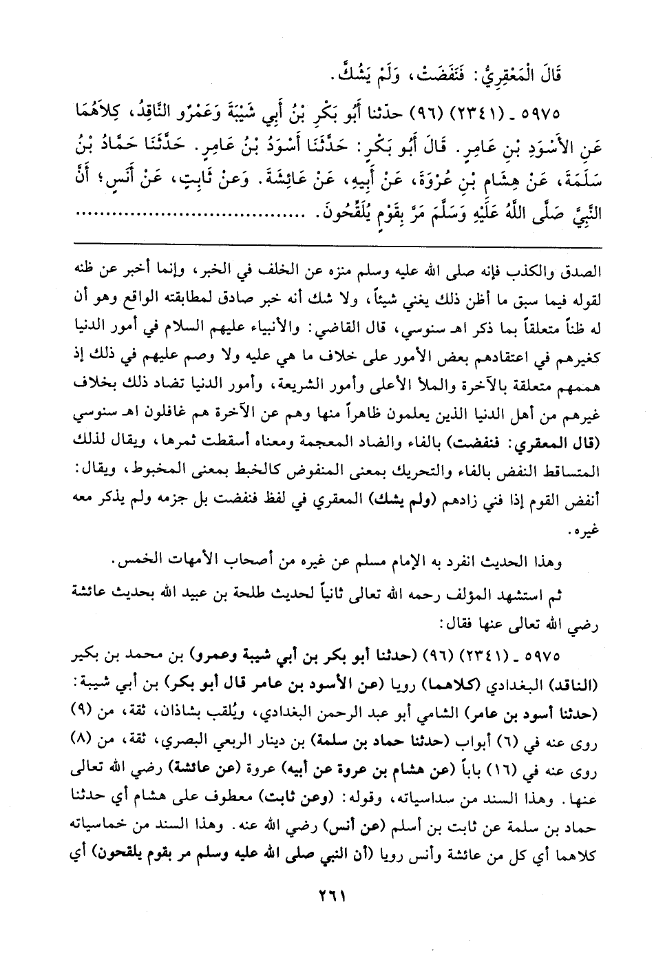 ٥٩٧٥ - (٢٣٤١) (٩٦) (حدثنا أبو بكر بن أبي شيبة وعمرو) بن محمد بن بكير (الناقد) البغدادي كلاهما) رويا (عن الأسود بن عامر قال أبو بكر) بن أبي شيبة: (حدثنا أسود بن عامر) الشامي أبو عبد الرحمن البغدادي، ويُلقب بشاذان، ثقة، من (٩) روى عنه في (٦) أبواب (حدثنا حماد بن سلمة) بن دينار الربعي البصري، ثقة، من (٨) روى عنه في (١٦) بابا (عن هشام بن عروة عن أبيه) عروة (عن عائشة) رضي الله تعالى عنها. وهذا السند من سداسياته، وقوله: (وعن ثابت) معطوف على هشام أي حدثنا حماد بن سلمة عن ثابت بن أسلم (عن أنس) رضي الله عنه. وهذا السند من خماسياته كلاهما أي كل من عائشة وأنس رويا (أن النبي صلى الله عليه وسلم مر بقوم يلقحون) أي