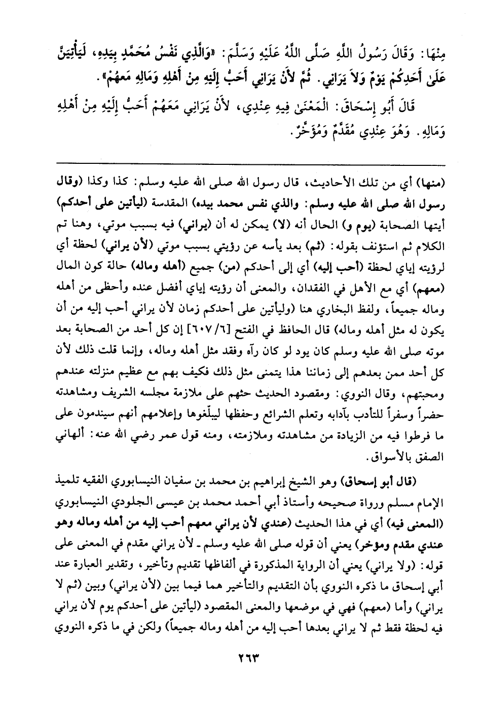 (قال أبو إسحاق) وهو الشيخ إبراهيم بن محمد بن سفيان النيسابوري الفقيه تلميذ الإمام مسلم ورواة صحيحه وأستاذ أبي أحمد محمد بن عيسى الجلودي النيسابوري (المعنى فيه) أي في هذا الحديث (عندي لأن يراني معهم أحب إليه من أهله وماله وهو عندي مقدم ومؤخر) يعني أن قوله صلى الله عليه وسلم - لأن يراني مقدم في المعنى على قوله: (ولا يراني) يعني أن الرواية المذكورة في ألفاظها تقديم وتأخير، وتقدير العبارة عند أبي إسحاق ما ذكره النووي بأن التقديم والتأخير هما فيما بين (لأن يراني) وبين (ثم لا يراني) وأما (معهم) فهي في موضعها والمعنى المقصود (ليأتين على أحدكم يوم لأن يراني فيه لحظة فقط ثم لا يراني بعدها أحب إليه من أهله وماله جميعًا) ولكن في ما ذكره النووي