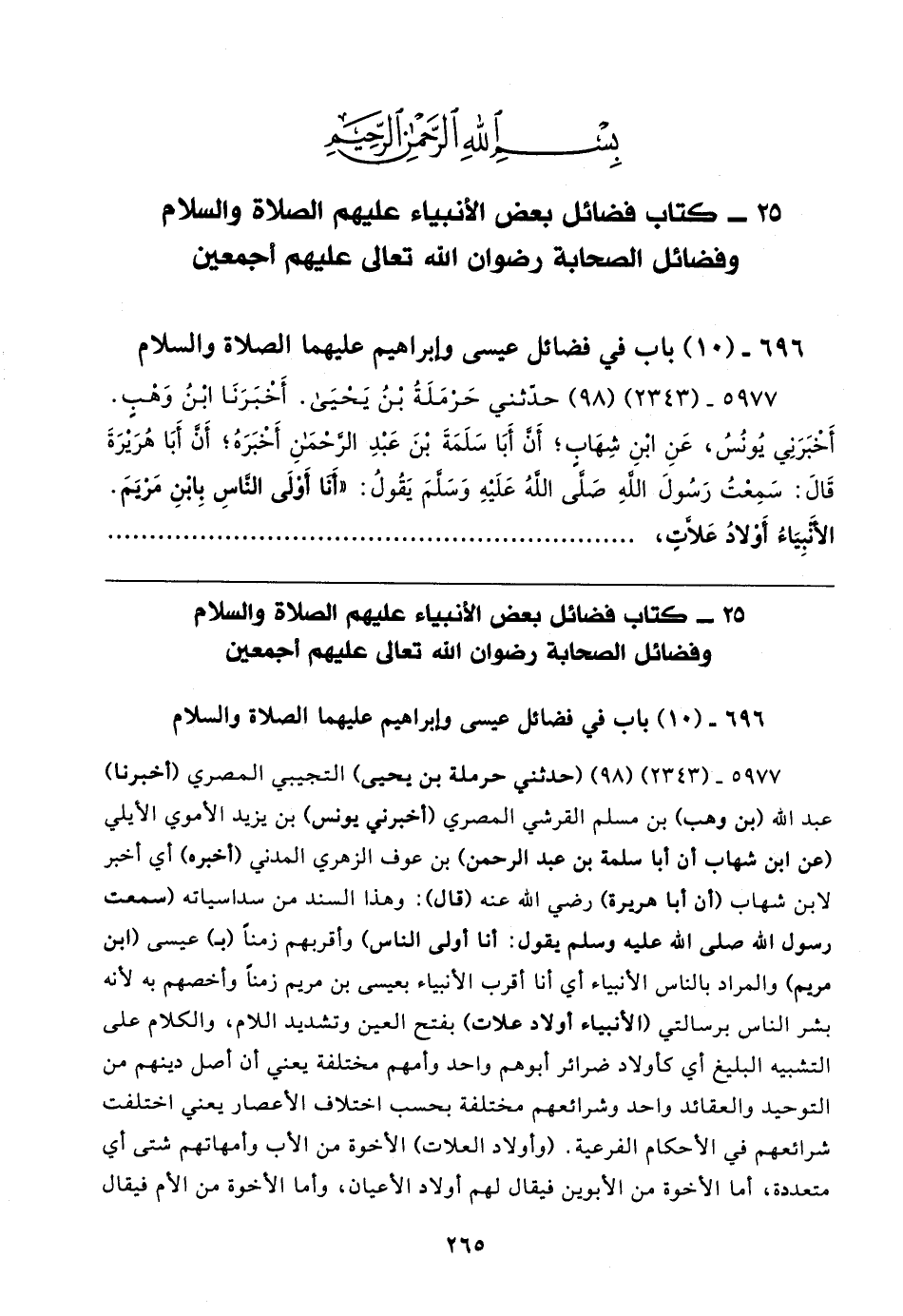 ٥٩٧٧ - (٢٣٤٣) (٩٨) حدثني حَرْمَلَةُ بْنُ يَحيَى. أَخْبَرَنَا ابنُ وَهْبٍ. أخْبَرَنِي يُونُسُ، عَنِ ابْنِ شِهَابٍ؛ أَن أَبَا سَلَمَةَ بْنَ عَبْدِ الرحمنِ أَخْبَرَهُ؛ أن أَبَا هُرَيرَةَ قَال: سَمِعْتُ رَسُولَ الله صلى الله عَلَيهِ وَسَلمَ يَقُولُ: "أنا أَوْلَى الناسِ بِابنِ مَريَمَ. الأَنبِيَاءُ أَوْلادُ عَلاتِ،