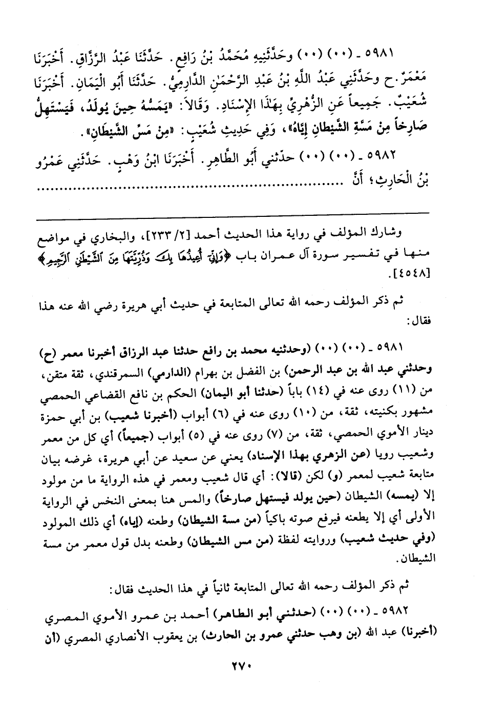 ٥٩٨١ - (٠٠) (٠٠) وحَدثَنِيهِ مُحَمدُ بن رَافِع. حَدَّثَنَا عَبدُ الرَّزاقِ. أَخبَرَنَا مَعْمَرٌ. ح وحَدَّثَنِي عَبدُ الله بْنُ عَبْدِ الرحْمَن الدَّارِمي. حَدَّثَنَا أَبُو اليَمَانِ. أَخبَرَنَا شُعَيبٌ. جَمِيعًا عَنِ الزهرِي بِهَذا الإِسْنَادِ. وَقَالا: "يَمَسهُ حِينَ يُولَدُ، فَيَسْتَهِل صَارِخًا مِن مَسَّةِ الشيطانِ إِياهُ"، وَفِي حَدِيثِ شُعَيب: "مِنْ مَس الشيطَانِ".