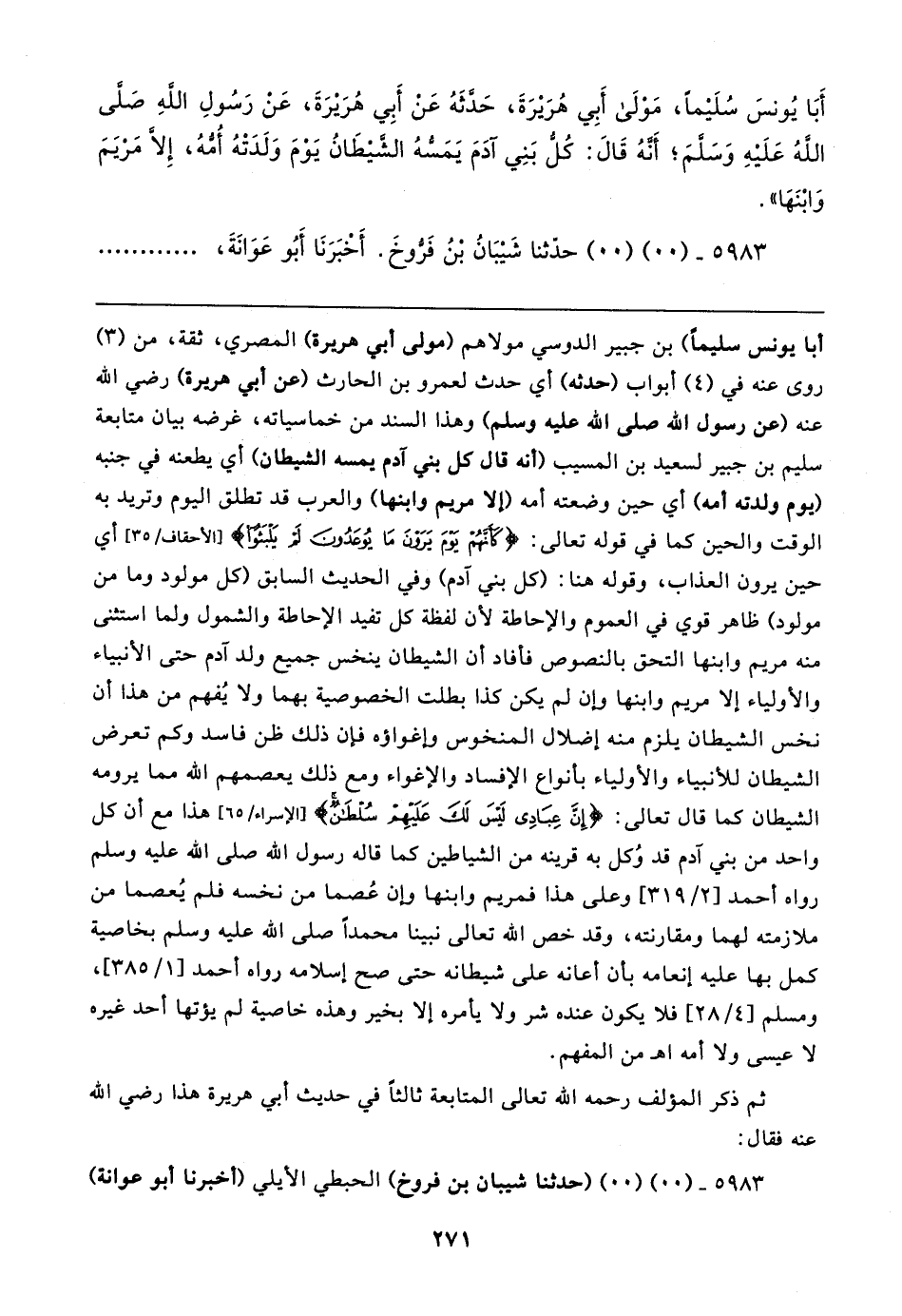 أبَا يُونسَ سُلَيمًا، مَولَي أَبِي هُرَيرَةَ، حَدثَهُ عَن أَبِي هُرَيرَةَ، عَن رَسُولِ الله صلى اللهُ عَلَيهِ وَسَلَّمَ؟ أَنهُ قَال: كُل بَنِي آدَمَ يَمَسهُ الشيطَانُ يَومَ وَلَدَتْهُ أُمه، إِلا مَريَمَ وَابْنَهَا".