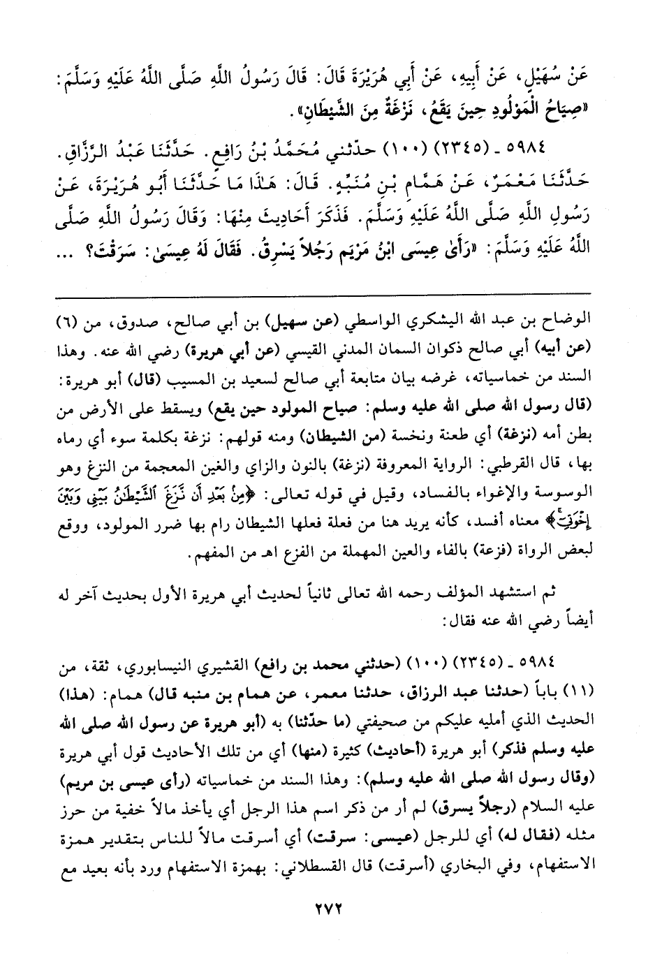 عَنْ سُهَيلٍ، عَنْ أَبِيهِ، عَنْ أَبِي هُرَيرَةَ قَال: قَال رَسُولُ الله صلى الله عَلَيهِ وَسَلمَ: "صِيَاحُ الْمَوْلُودِ حِينَ يَقَعُ، نَزْغة مِنَ الشيطَانِ".