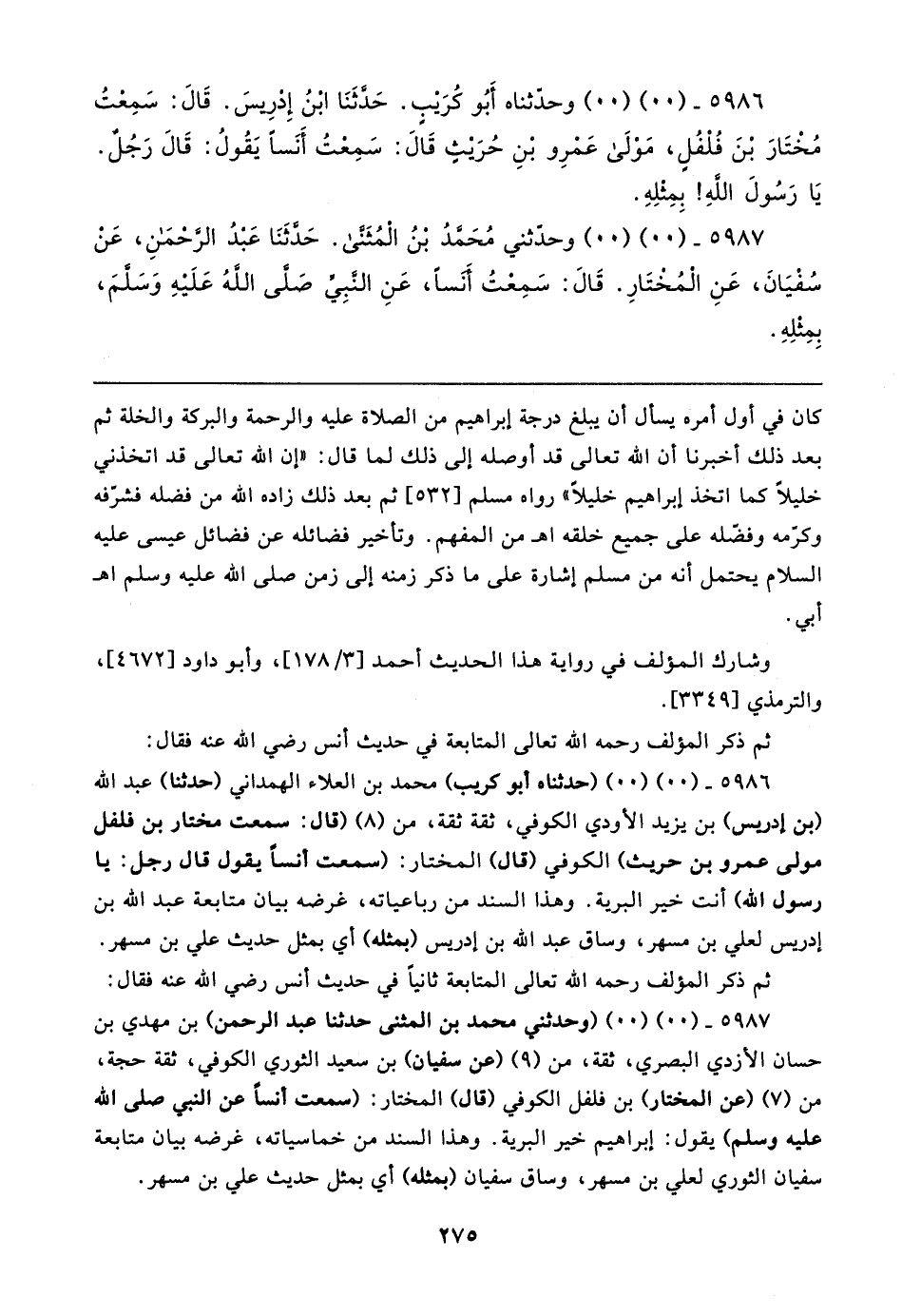 ٥٩٨٧ - (٠٠) (٠٠) (وحدثني محمد بن المثنى حدثنا عبد الرحمن) بن مهدي بن حسان الأزدي البصري، ثقة، من (٩) (عن سفيان) بن سعيد الثوري الكوفي، ثقة حجة، من (٧) (عن المختار) بن فلفل الكوفي (قال) المختار: (سمعت أنسًا عن النبي صلى الله عليه وسلم) يقول: إبراهيم خير البرية. وهذا السند من خماسياته، غرضه بيان متابعة سفيان الثوري لعلي بن مسهر، وساق سفيان (بمثله) أي بمثل حديث علي بن مسهر.