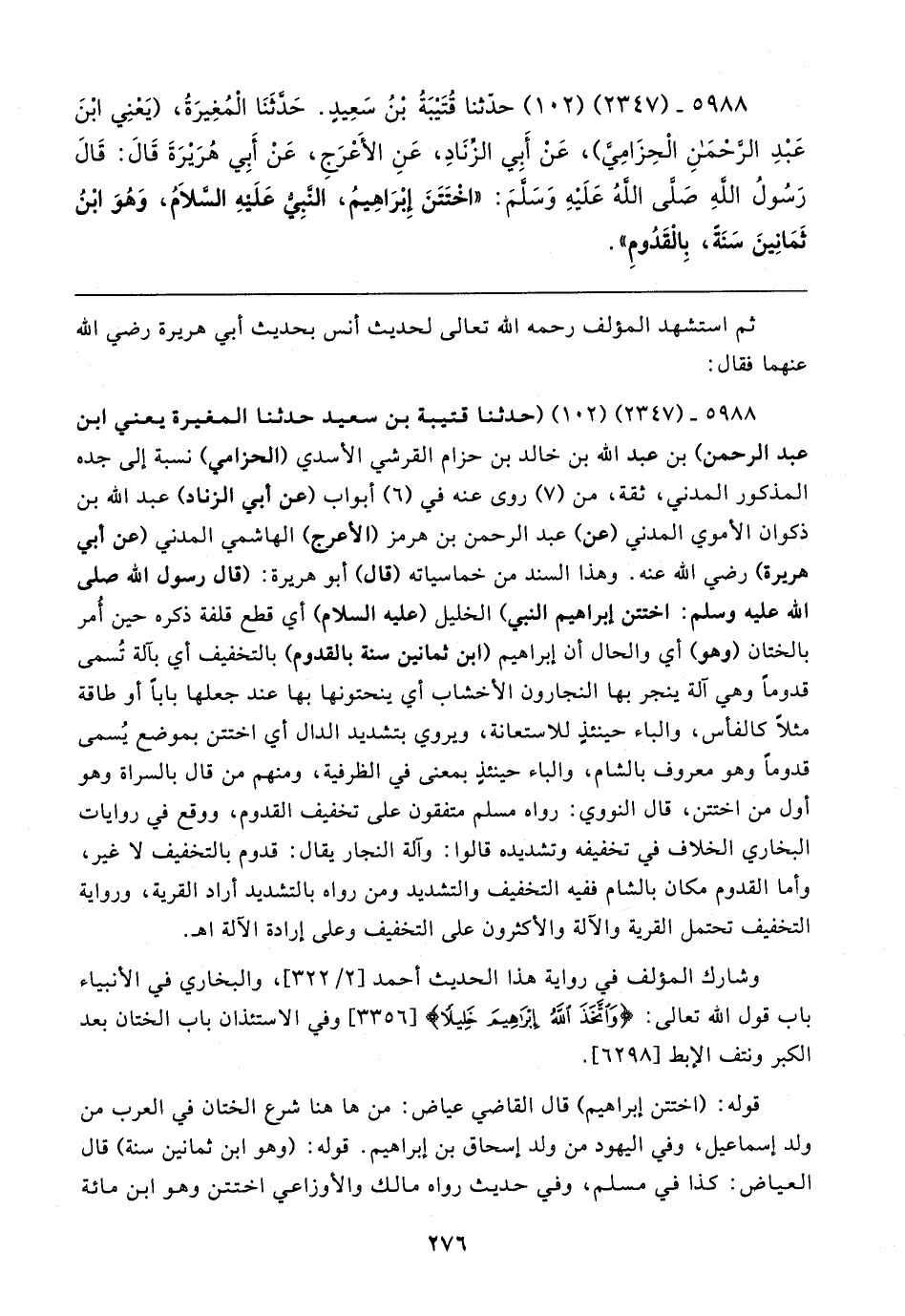 ٥٩٨٨ - (٢٣٤٧) (١٠٢) حدَّثنا قُتَيبَةُ بن سَعِيدٍ. حَدَّثَنَا المغِيرَةُ، (يَعْنِي ابْنَ عَبْدِ الرحْمَنِ الْحِزَامي)، عَنْ أَبِي الزنَادِ، عَنِ الأَعْرَجِ، عَنْ أَبِي هُرَيرَةَ قَال: قَال رَسُولُ الله صلى الله عَلَيهِ وَسَلمَ: "اخْتَتَنَ إِبْرَاهِيمُ، النبِي عَلَيهِ السلامُ، وَهُوَ ابْنُ ثَمَانِينَ سَنَة، بِالْقَدُومِ"