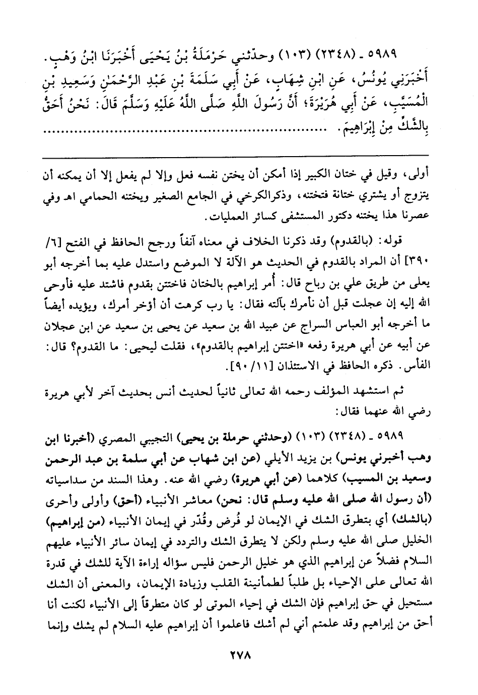 ٥٩٨٩ - (٢٣٤٨) (١٠٣) (وحدثني حرملة بن يحيى) التجيبي المصري (أخبرنا ابن وهب أخبرني يونس) بن يزيد الأيلي (عن ابن شهاب عن أبي سلمة بن عبد الرحمن وسعيد بن المسيب) كلاهما (عن أبي هريرة) رضي الله عنه. وهذا السند من سداسياته (أن رسول الله صلى الله عليه وسلم قال: نحن) معاشر الأنبياء (أحق) وأولى وأحرى (بالشك) أي بتطرق الشك في الإيمان لو فُرض وقُدر في إيمان الانبياء (من إبراهيم) الخليل صلى الله عليه وسلم ولكن لا يتطرق الشك والتردد في إيمان سائر الانبياء عليهم السلام فضلًا عن إبراهيم الذي هو خليل الرحمن فليس سؤاله إراءة الآية للشك في قدرة الله تعالى على الإحياء بل طلبًا لطمأنينة القلب وزيادة الإيمان، والمعنى أن الشك مستحيل في حق إبراهيم فإن الشك في إحياء الموتى لو كان متطرقًا إلى الأنبياء لكنت أنا أحق من إبراهيم وقد علمتم أني لم أشك فاعلموا أن إبراهيم - عليه السلام - لم يشك وإنما