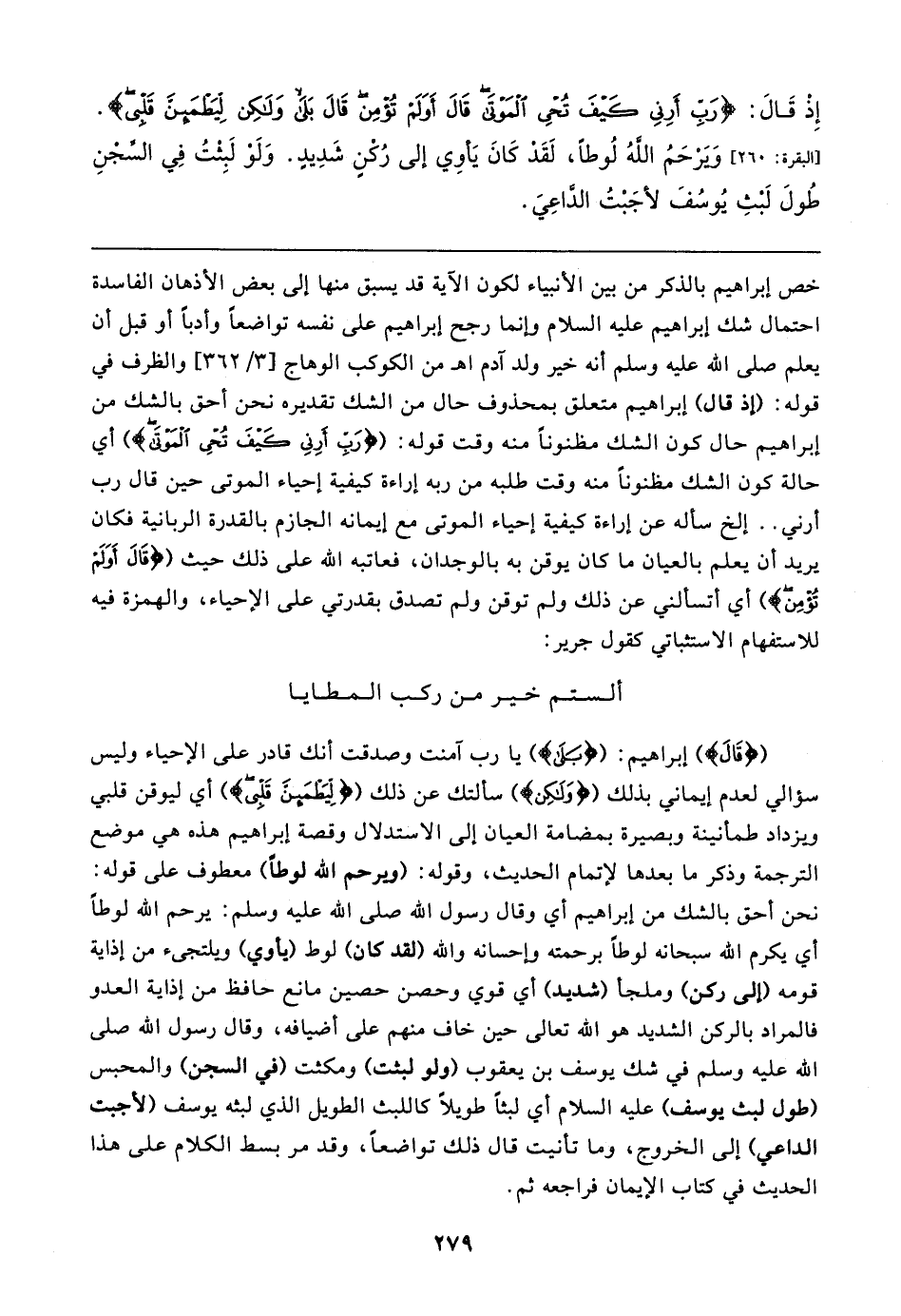 إِذْ قَال: {رَبِّ أَرِنِي كَيفَ تُحْيِ الْمَوْتَى قَال أَوَلَمْ تُؤْمِنْ قَال بَلَى وَلَكِنْ لِيَطْمَئِنَّ قَلْبِي} [البقرة: ٢٦٠] ويرْحَمُ الله لُوطًا، لَقَد كَانَ يَأوي إلى رُكنٍ شَدِيدٍ. وَلَو لَبِثتُ فِي السجنِ طُولَ لَبثِ يُوسُفَ لأجَبْتُ الداعِيَ