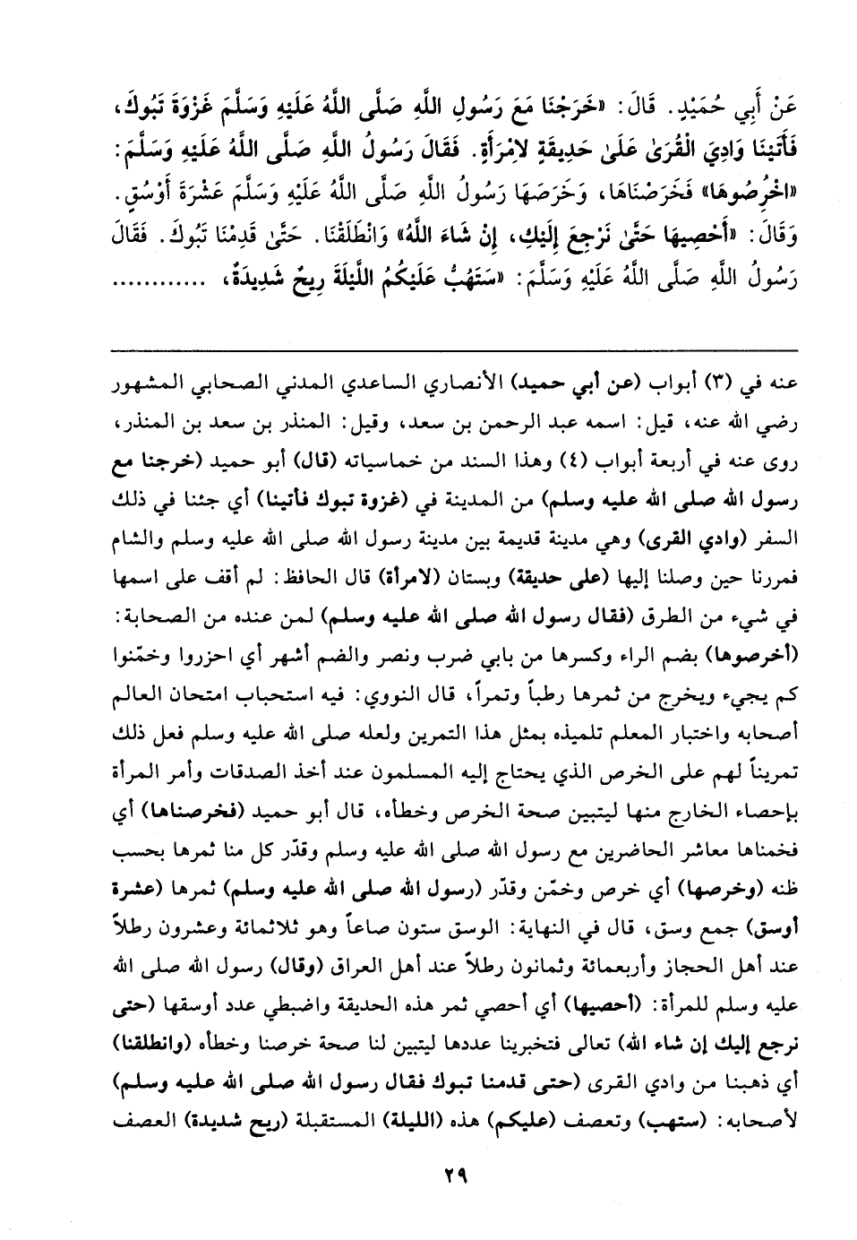 عَنْ أَبِي حُمَيدٍ. قَال: "خَرَجْنَا مَعَ رَسُولِ اللهِ صَلَّى اللهُ عَلَيهِ وَسَلَّمَ غَزْوَةَ تَبُوكَ، فَأَتَينَا وَادِيَ الْقُرَى عَلَى حَدِيقَةٍ لامْرَأَةٍ. فَقَال رَسُولُ اللهِ صَلَّى اللهُ عَلَيهِ وَسَلَّمَ: "اخْرُصُوهَا" فَخَرَصْنَاهَا، وَخَرَصَهَا رَسُولُ اللهِ صَلَّى اللهُ عَلَيهِ وَسَلَّمَ عَشرَةَ أَوسُقٍ. وَقَال: "أَحْصِيهَا حَتَّى نَرْجِعَ إِلَيكِ، إِنْ شَاءَ اللهُ" وَانْطَلَقْنَا. حَتَّى قَدِمْنَا تَبُوكَ. فَقَال رَسُولُ اللهِ صَلَّى اللهُ عَلَيهِ وَسَلَّمَ: "سَتَهُبُّ عَلَيكُمُ اللَّيلَةَ رِيحٌ شَدِيدَةٌ،