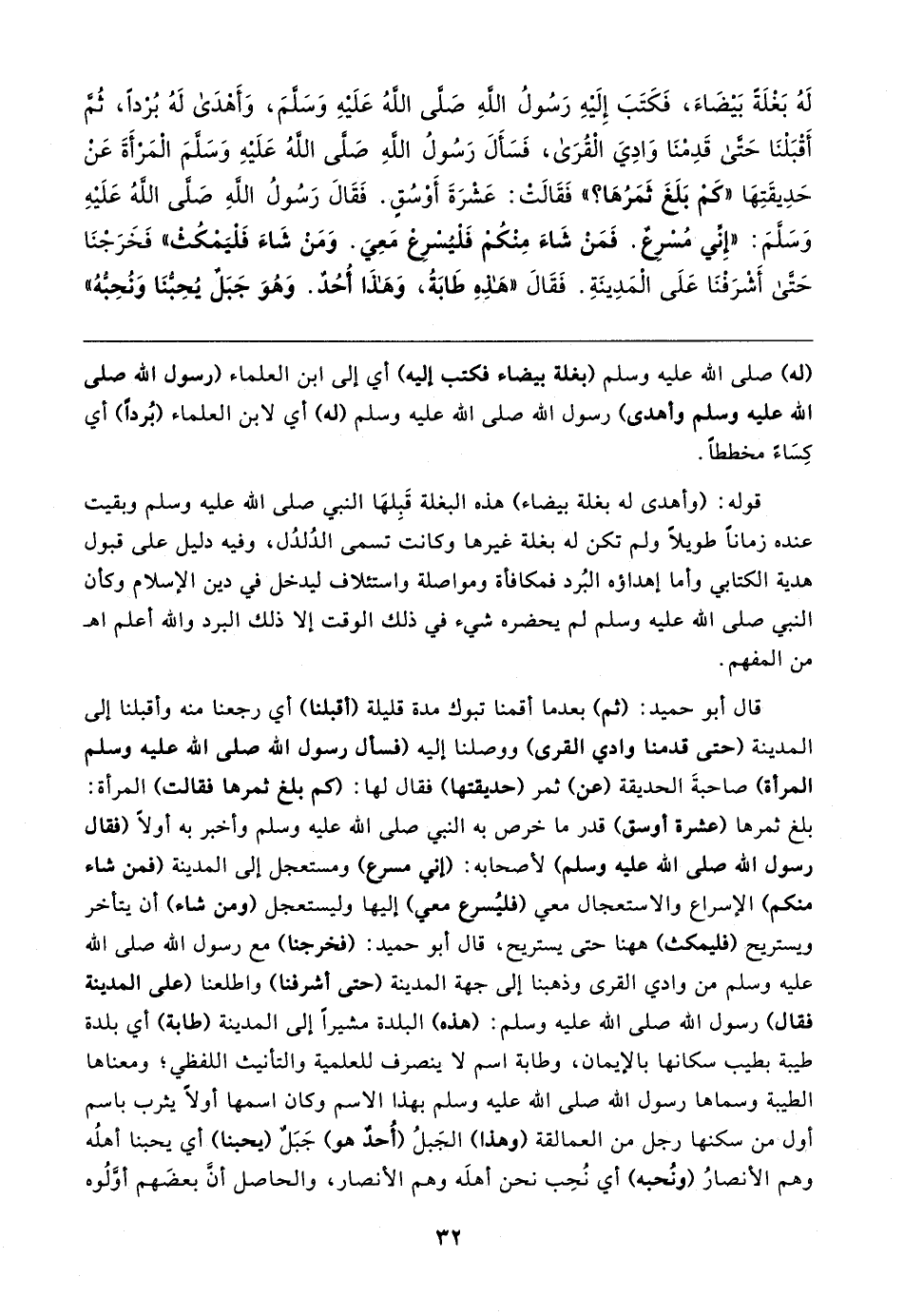 لَهُ بَغْلَةً بَيضَاءَ، فَكَتَبَ إِلَيهِ رَسُولُ اللهِ صَلَّى اللهُ عَلَيهِ وَسَلَّمَ، وَأَهْدَى لَهُ بُرْدًا، ثُمَّ أَقْبَلْنَا حَتَّى قَدِمْنَا وَادِيَ الْقُرَى، فَسَأَلَ رَسُولُ اللهِ صَلَّى اللهُ عَلَيهِ وَسَلَّمَ الْمَرْأَةَ عَن حَدِيقَتِهَا "كَمْ بَلَغَ ثَمَرُهَا؟ " فَقَالت: عَشْرَةَ أَوْسُقٍ. فَقَال رَسُولُ اللهِ صَلَّى اللهُ عَلَيهِ وَسَلَّمَ: "إِنِّي مُسْرِعٌ. فَمَنْ شَاءَ مِنْكُنم فَلْيُسْرِعْ مَعِيَ. وَمَنْ شَاءَ فَلْيَمْكُثْ" فَخَرَجْنَا حَتَّى أَشْرَفْنَا عَلَى الْمَدِينَةِ. فَقَال "هَذِهِ طَابَةُ، وَهَذَا أُحُدٌ. وَهُوَ جَبَلٌ يُحِبُّنَا وَنُحِبُّهُ"