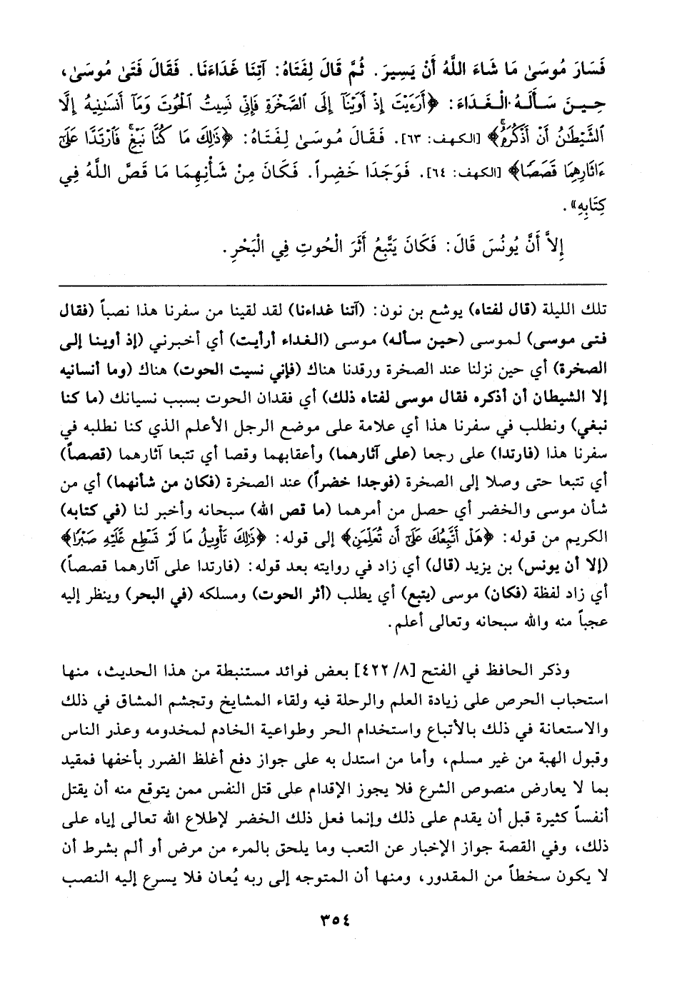 وذكر الحافظ في الفتح [٨/ ٤٢٢] بعض فوائد مستنبطة من هذا الحديث، منها استحباب الحرص على زيادة العلم والرحلة فيه ولقاء المشايخ وتجشم المشاق في ذلك والاستعانة في ذلك بالأتباع واستخدام الحر وطواعية الخادم لمخدومه وعذر الناس وقبول الهبة من غير مسلم، وأما من استدل به على جواز دفع أغلظ الضرر بأخفها فمقيد بما لا يعارض منصوص الشرع فلا يجوز الإقدام على قتل النفس ممن يتوقع منه أن يقتل أنفسًا كثيرة قبل أن يقدم على ذلك وإنما فعل ذلك الخضر لإطلاع الله تعالى إياه على ذلك، وفي القصة جواز الإخبار عن التعب وما يلحق بالمرء من مرض أو ألم بشرط أن لا يكون سخطًا من المقدور، ومنها أن المتوجه إلى ربه يُعان فلا يسرع إليه النصب