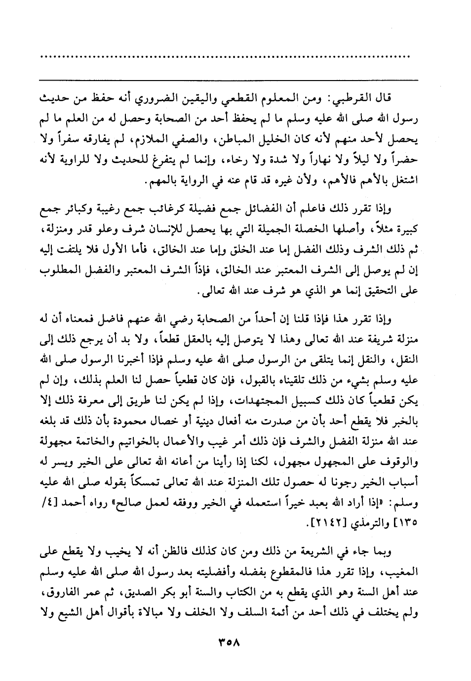 وإذا تقرر هذا فإذا قلنا إن أحدًا من الصحابة رضي الله عنهم فاضل فمعناه أن له منزلة شريفة عند الله تعالى وهذا لا يتوصل إليه بالعقل قطعًا، ولا بد أن يرجع ذلك إلى النقل، والنقل إنما يتلقى من الرسول صلى الله عليه وسلم فإذا أخبرنا الرسول صلى الله عليه وسلم بشيء من ذلك تلقيناه بالقبول، فإن وإن قطعيًّا حصل لنا العلم بذلك، وإن لم يكن قطعيًّا كان ذلك كسبيل المجتهدات، وإذا لم يكن لنا طريق إلى معرفة ذلك إلا بالخبر فلا يقطع أحد بأن من صدرت منه أفعال دينية أو خصال محمودة بأن ذلك قد بلغه عند الله منزلة الفضل والشرف فإن ذلك أمر غيب والأعمال بالخواتيم والخاتمة مجهولة والوقوف على المجهول مجهول، لكنا إذا رأينا من أعانه الله تعالى على الخير ويسر له أسباب الخير رجونا له حصول تلك المنزلة عند الله تعالى تمسكًا بقوله صلى الله عليه وسلم: "إذا أراد الله بعبد خيرًا استعمله في الخير ووفقه لعمل صالح" رواه أحمد [٤/ ١٣٥] والترمذي [٢١٤٢].