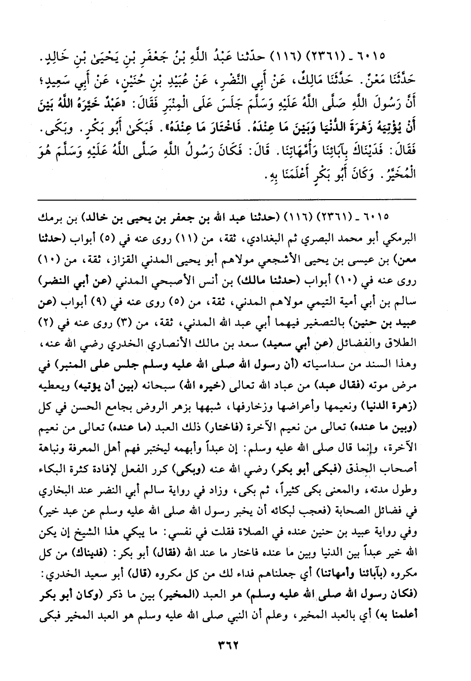 ٦٠١٥ - (٢٣٦١) (١١٦) (حدثنا عبد الله بن جعفر بن يحيى بن خالد) بن برمك البرمكي أبو محمد البصري ثم البغدادي، ثقة، من (١١) روى عنه في (٥) أبواب (حدثنا معن) بن عيسى بن يحيى الأشجعي مولاهم أبو يحيى المدني القزاز، ثقة، من (١٠) روى عنه في (١٠) أبواب (حدثنا مالك) بن أنس الأصبحي المدني (عن أبي النضر) سالم بن أبي أمية التيمي مولاهم المدني، ثقة، من (٥) روى عنه في (٩) أبواب (عن عبيد بن حنين) بالتصغير فيهما أبي عبد الله المدني، ثقة، من (٣) روى عنه في (٢) الطلاق والفضائل (عن أبي سعيد) سعد بن مالك الأنصاري الخدري رضي الله عنه، وهذا السند من سداسياته (أن رسول الله صلى الله عليه وسلم جلس على المنبر) في مرض موته (فقال عبد) من عباد الله تعالى (خيره الله) سبحانه (بين أن يؤتيه) ويعطيه (زهرة الدنيا) ونعيمها وأعراضها وزخارفها، شبهها بزهر الروض بجامع الحسن في كل (وبين ما عنده) تعالى من نعيم الآخرة (فاختار) ذلك العبد (ما عنده) تعالى من نعيم الآخرة، وإنما قال صلى الله عليه وسلم: إن عبدًا وأبهمه ليختبر فهم أهل المعرفة ونباهة أصحاب الحذق (فبكى أبو بكر) رضي الله عنه (وبكى) كرر الفعل لإفادة كثرة البكاء وطول مدته، . والمعنى بكى كثيرًا، ثم بكى، وزاد في رواية سالم أبي النضر عند البخاري في فضائل الصحابة (فعجب لبكائه أن يخبر رسول الله صلى الله عليه وسلم عن عبد خير) وفي رواية عبيد بن حنين عنده في الصلاة فقلت في نفسي: ما يبكي هذا الشيخ إن يكن الله خير عبدًا بين الدنيا وبين ما عنده فاختار ما عند الله (فقال) أبو بكر: (فديناك) من كل مكروه (بآبائنا وأمهاتنا) أي جعلناهم فداء لك من كل مكروه (قال) أبو سعيد الخدري: (فكان رسول الله صلى: الله عليه وسلم) هو العبد (المخير) بين ما ذكر (وكان أبو بكر أعلمنا به) أي بالعبد المخير، وعلم أن النبي صلى الله عليه وسلم هو العبد المخير فبكى
