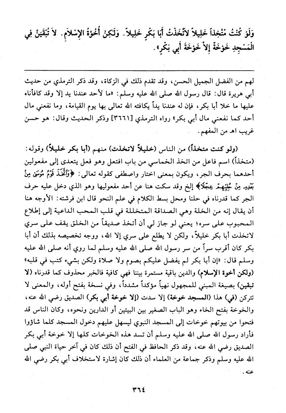 وَلَوْ كُنْتُ مُتَّخِذًا خَلِيلًا لاتَّخَذْتُ أَبا بَكْرٍ خَلِيلًا. وَلكِنْ أُخُوَّةُ الإِسْلامِ. لَا تُبْقَيَن فِي الْمَسْجِدِ خَوْخَةٌ إِلَّا خَوْخَةَ أَبِي بَكْرٍ"
