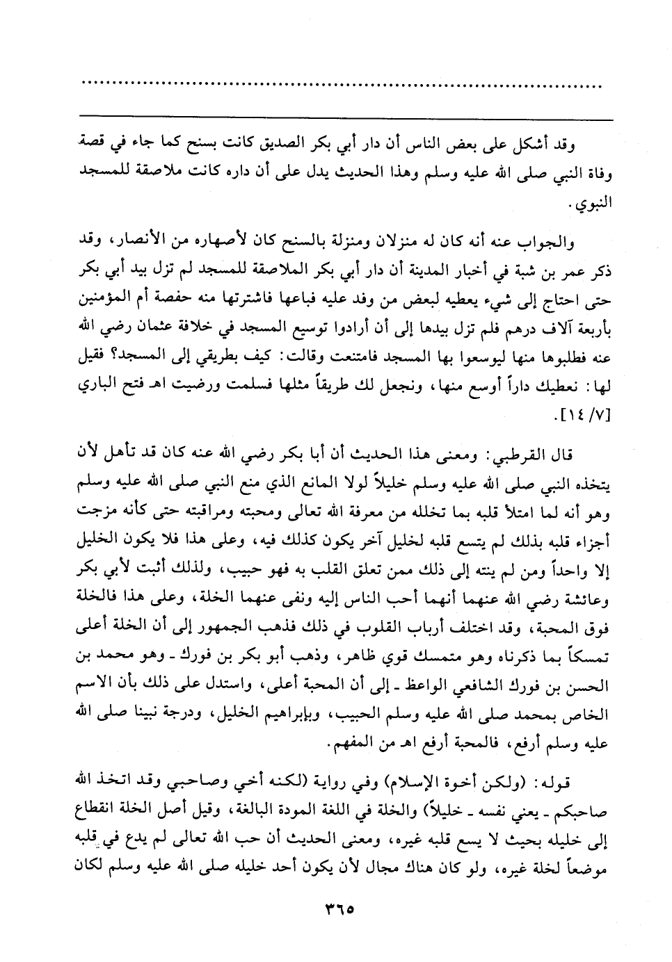 قال القرطبي: ومعنى هذا الحديث أن أبا بكر رضي الله عنه كان قد تأهل لأن يتخذه النبي صلى الله عليه وسلم خليلًا لولا المانع الذي منع النبي صلى الله عليه وسلم وهو أنه لما امتلأ قلبه بما تخلله من معرفة الله تعالى ومحبته ومراقبته حتى كأنه مزجت أجزاء قلبه بذلك لم يتسع قلبه لخليل آخر يكون كذلك فيه، وعلى هذا فلا يكون الخليل إلا واحدًا ومن لم ينته إلى ذلك ممن تعلق القلب به فهو حبيب، ولذلك أثبت لأبي بكر وعائشة رضي الله عنهما أنهما أحب الناس إليه ونفى عنهما الخلة، وعلى هذا فالخلة فوق المحبة، وقد اختلف أرباب القلوب في ذلك فذهب الجمهور إلى أن الخلة أعلى تمسكًا بما ذكرناه وهو متمسك قوي ظاهر، وذهب أبو بكر بن فورك- وهو محمد بن الحسن بن فورك الشافعي الواعظ- إلى أن المحبة أعلى، واستدل على ذلك بأن الاسم الخاص بمحمد صلى الله عليه وسلم الحبيب، وبإبراهيم الخليل، ودرجة نبينا صلى الله عليه وسلم أوفع، فالمحبة أرفع اهـ من المفهم.