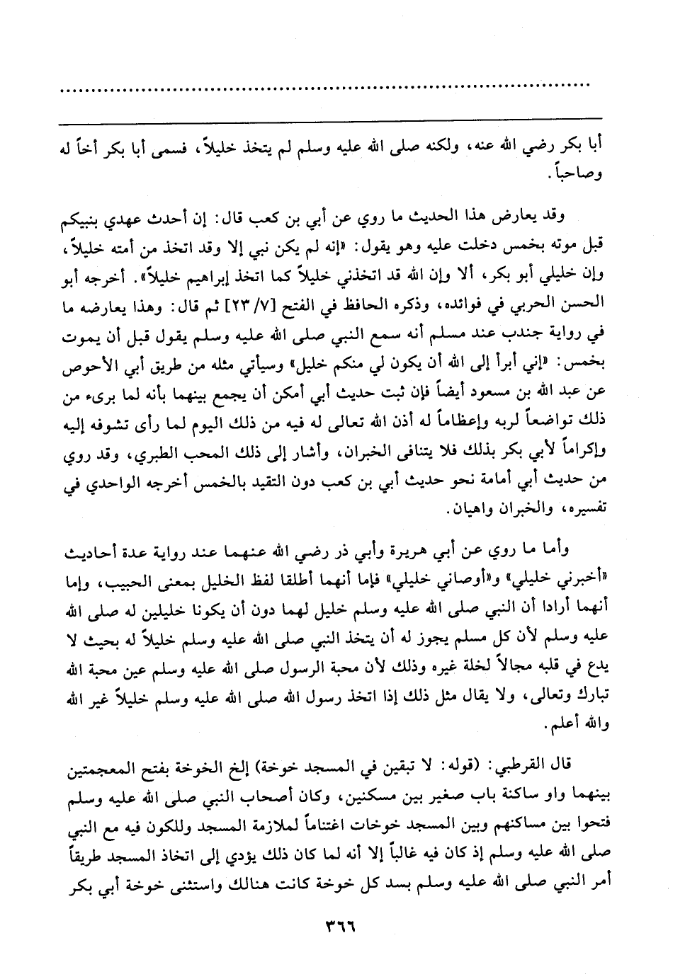 وأما ما روي عن أبي هريرة وأبي ذر رضي الله عنهما عند رواية عدة أحاديث "أخبرني خليلي" و"أوصاني خليلي" فإما أنهما أطلقا لفظ الخليل بمعنى الحبيب، هاما أنهما أرادا أن النبي صلى الله عليه وسلم خليل لهما دون أن يكونا خليلين له صلى الله عليه وسلم لأن كل مسلم يجوز له أن يتخذ النبي صلى الله عليه وسلم خليلًا له بحيث لا يدع في قلبه مجالًا لخلة غيره وذلك لأن محبة الرسول صلى الله عليه وسلم عين محبة الله تبارك وتعالى، ولا يقال مثل ذلك إذا اتخذ رسول الله صلى الله عليه وسلم خليلًا غير الله والله أعلم.