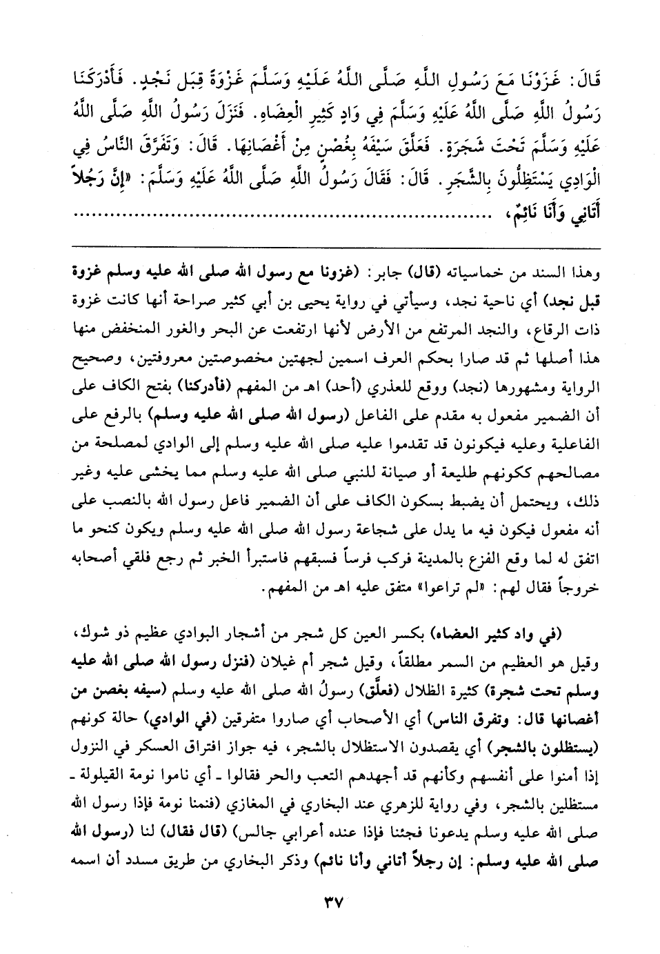 قَال: غَزَوْنَا مَعَ رَسُولِ اللهِ صَلَّى اللهُ عَلَيهِ وَسَلَّمَ غَزْوَةً قِبَل نَجْدٍ. فَأَدْرَكَنَا رَسُولُ اللهِ صَلَّى اللهُ عَلَيهِ وَسَلَّمَ في وَادٍ كَثِيرِ الْعِضَاهِ. فَنَزَلَ رَسُولُ اللهِ صَلَّى اللهُ عَلَيهِ وَسَلَّمَ تَحْتَ شَجَرَةٍ. فَعَلَّقَ سَيفَهُ بِغُصْنٍ مِن أَغْصَانِهَا. قَال: وَتَفَرَّقَ النَّاسُ فِي الْوَادِي يَسْتَظِلُّونَ بِالشَّجَرِ. قَال: فَقَال رَسُولُ اللهِ صَلَّى اللهُ عَلَيهِ وَسَلَّمَ: "إِنَّ رَجُلًا أَتَانِي وَأَنَا نَائِمٌ،
