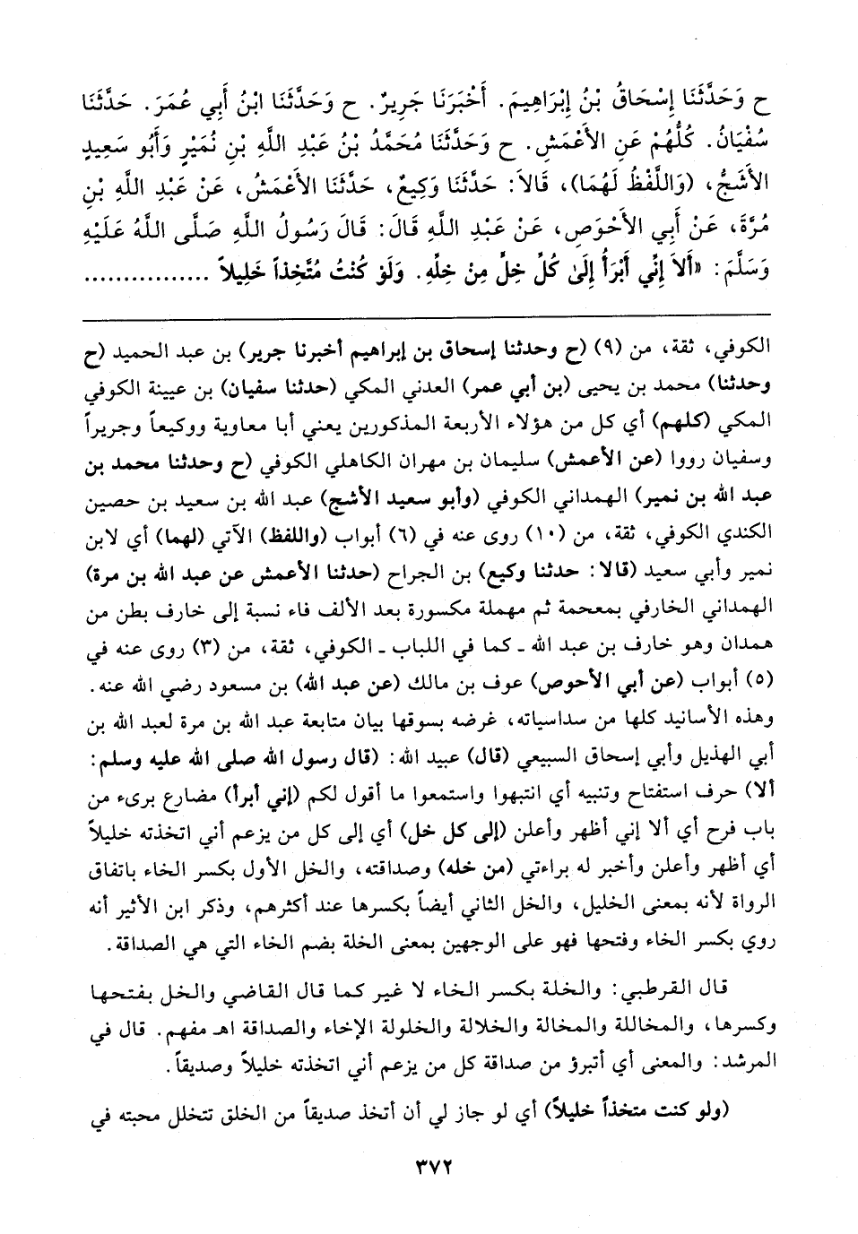 ح وَحَدثَنَا إِسْحَاقُ بْنُ إِبْرَاهِيمَ. أَخبَرَنَا جَرِيرٌ. ح وَحَدَّثَنَا ابْنُ أَبِي عُمَرَ. حَدَّثَنَا سُفْيَانُ. كُلُّهُمْ عَنِ الأَعْمَشِ. ح وَحَدثَنَا مُحَمَّدُ بْنُ عَبْدِ اللهِ بْنِ نُمَيرٍ وَأَبُو سَعِيدٍ الأَشَجُّ، (وَاللَّفْظُ لَهُمَا)، قَالا: حَدَّثَنَا وَكِيعٌ، حَدَّثَنَا الأَعْمَشُ، عَنْ عَبدِ اللهِ بْنِ مُرَّةَ، عَنْ أَبِي الأَحْوَصِ، عَنْ عَبْدِ اللهِ قَال: قَال رَسُولُ اللهِ صَلى اللهُ عَلَيهِ وَسَلمَ: "أَلا إِنِّي أَبْرَأُ إِلَى كُل خِلٍّ مِنْ خِلِّهِ. وَلَوْ كُنْتُ مُتَّخِذًا خَلِيلًا