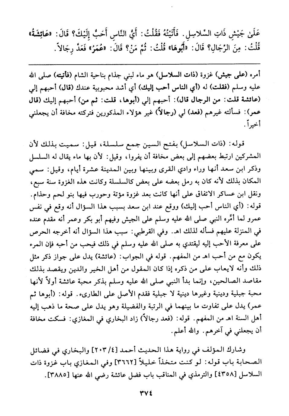 عَلَي جَيشِ ذَاتِ السَّلاسِلِ. فَأَتَيتُهُ فَقُلْتُ: أَيُّ النَّاسِ أَحَبُّ إِلَيكَ؟ قَال: "عَائِشَةُ" قُلْتُ: مِنَ الرِّجَالِ؟ قَال: "أَبُوهَا" قُلتُ: ثُم مَنْ؟ قَال: "عُمَرُ" فَعَدَّ رِجَالًا