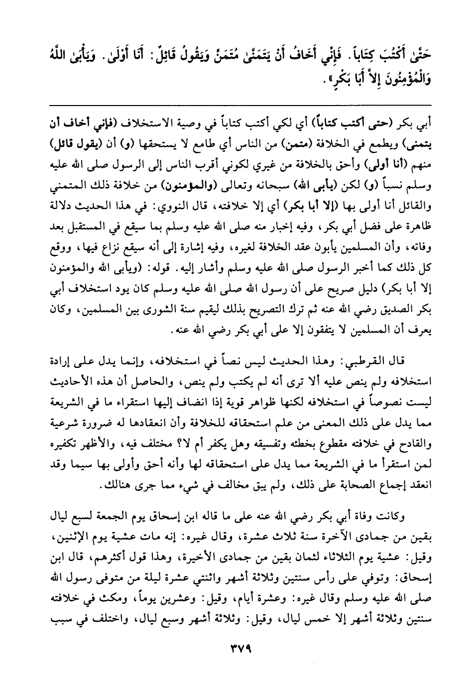 قال القرطبي: وهذا الحديث ليس نصا في استخلافه، وإنما يدل على إرادة استخلافه ولم ينص عليه ألا ترى أنه لم يكتب ولم ينص، والحاصل أن هذه الأحاديث ليست نصوصًا في استخلافه لكنها ظواهر قوية إذا انضاف إليها استقراء ما في الشريعة مما يدل على ذلك المعنى من علم استحقاقه للخلافة وأن انعقادها له ضرورة شرعية والقادح في خلافته مقطوع بخطئه وتفسيقه وهل يكفر أم لا؟ مختلف فيه، والأظهر تكفيره لمن استقرأ ما في الشريعة مما يدل على استحقاقه لها وأنه أحق وأولى بها سيما وقد انعقد إجماع الصحابة على ذلك، ولم يبق مخالف في شيء مما جرى هنالك.