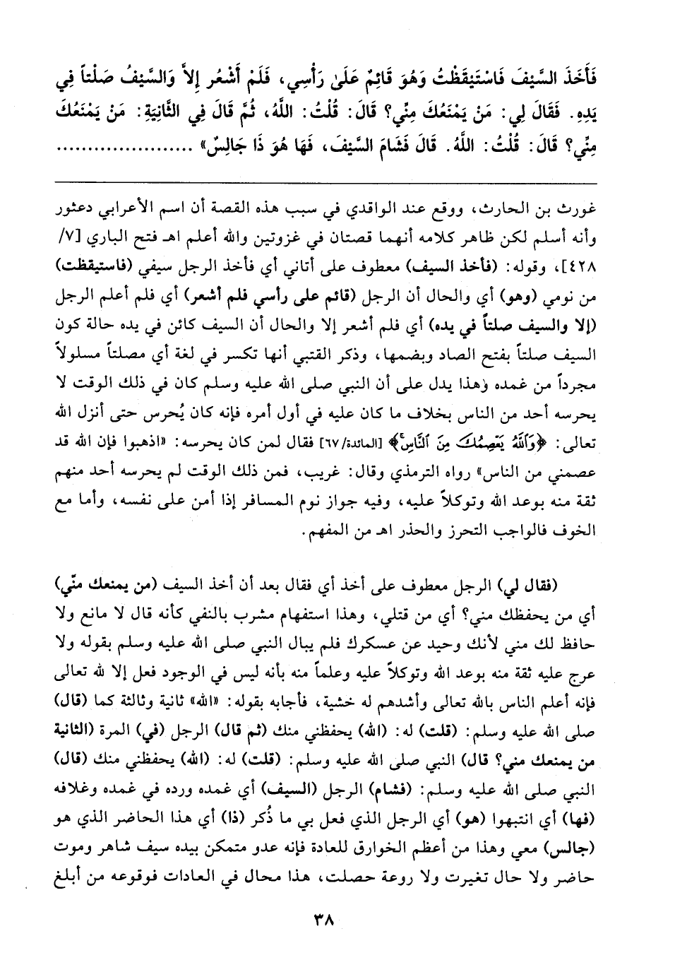 فَأَخَذَ السَّيفَ فَاسْتَيقَظتُ وَهُوَ قَائِمٌ عَلَى رَأْسِي، فَلَمْ أَشْعُر إلا وَالسَّيفُ صَلْتًا فِي يَدِهِ. فَقَال لِي: مَنْ يَمْنَعُكَ مِنِّي؟ قَال: قُلْتُ: اللهُ، ثُمَّ قَال فِي الثَّانِيَةِ: مَنْ يَمْنَعُكَ مِنِّي؟ قَال: قُلْتُ: اللهُ. قَال فَشَامَ السَّيفَ، فَهَا هُوَ ذَا جَالِسٌ"