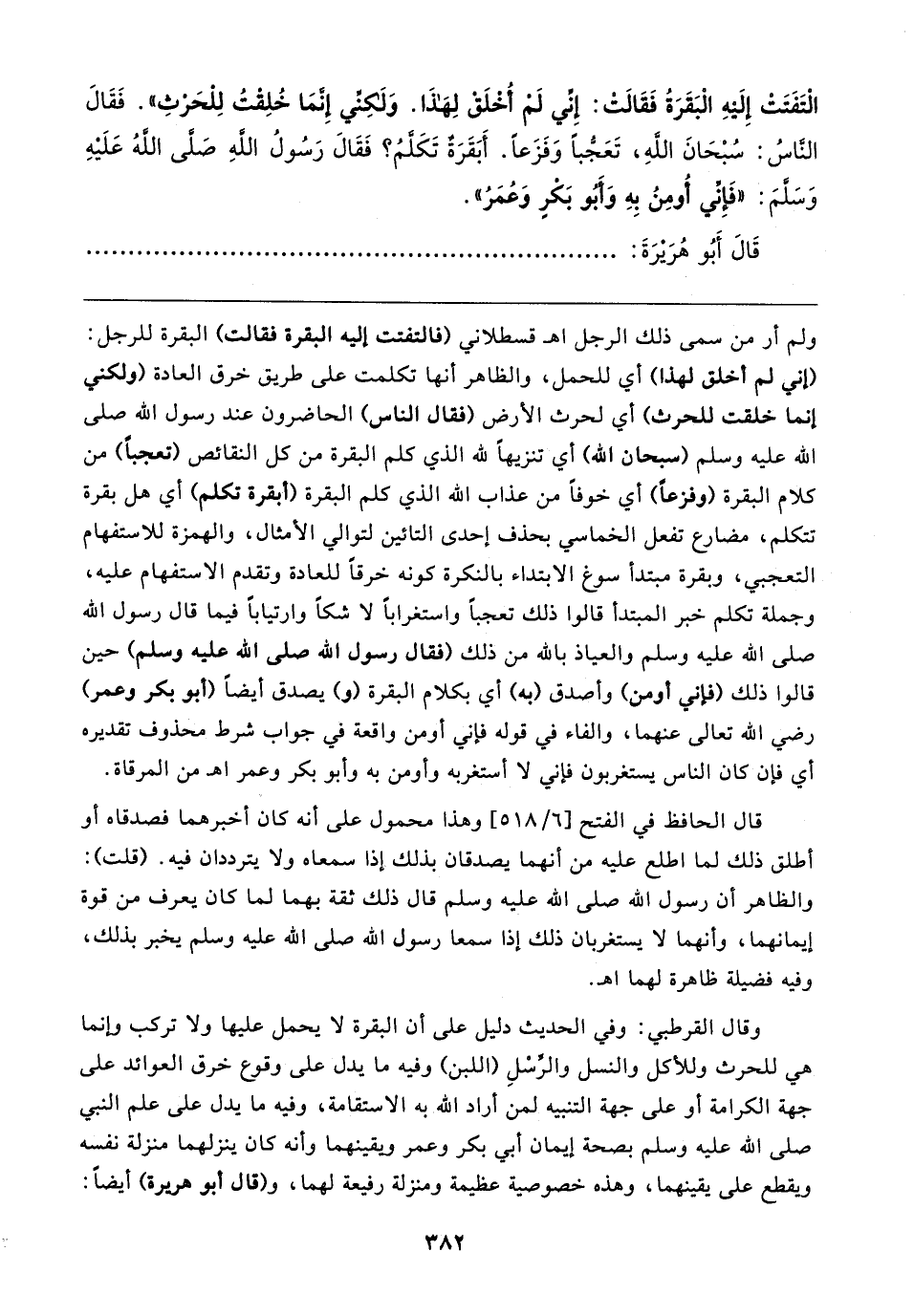وقال القرطبي: وفي الحديث دليل على أن البقرة لا يحمل عليها ولا تركب وإنما هي للحرث وللأكل والنسل والرِّسْلِ (اللبن) وفيه ما يدل على وقوع خرق العوائد على جهة الكرامة أو على جهة التنبيه لمن أراد الله به الاستقامة، وفيه ما يدل على علم النبي صلى الله عليه وسلم بصحة إيمان أبي بكر وعمر ويقينهما وأنه كان ينزلهما منزلة نفسه ويقطع على يقينهما، وهذه خصوصية عظيمة ومنزلة رفيعة لهما، و (قال أبو هريرة) أيضًا: