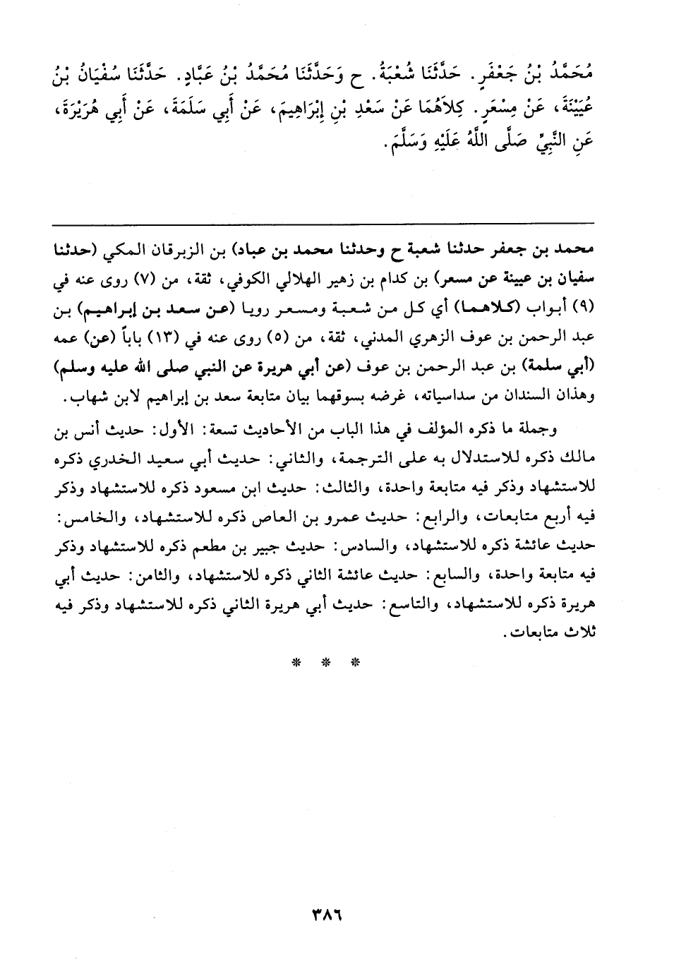 محمد بن جعفر حدثنا شعبة ح وحدثنا محمد بن عباد) بن الزبرقان المكي (حدثنا سفيان بن عيينة عن مسعر) بن كدام بن زهير الهلالي الكوفي، ثقة، من (٧) روى عنه في (٩) أبواب كلاهما) أي كل من شعبة ومسعر رويا (عن سعد بن إبراهيم) بن عبد الرحمن بن عوف الزهري المدني، ثقة، من (٥) روى عنه في (١٣) بابا (عن) عمه (أبي سلمة) بن عبد الرحمن بن عوف (عن أبي هريرة عن النبي صلى الله عليه وسلم) وهذان السندان من سداسياته، غرضه بسوقهما بيان متابعة سعد بن إبراهيم لابن شهاب.