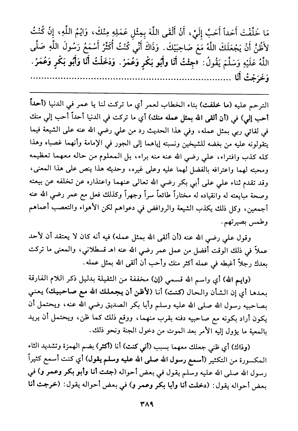 مَا خَلَّفْتَ أَحَدًا أَحَبَّ إِلَيَّ، أَنْ أَلْقَى اللهَ بِمِثلِ عَمَلِهِ مِنكَ، وَايمُ اللهِ، إِن كُنتُ لأَظُنُّ أَنْ يَجعَلَكَ اللهُ مَعَ صَاحِبَيكَ. وَذَاكَ أَنِّي كُنتُ أُكَثِّرُ أَسْمَعُ رَسُولَ اللهِ صَلى اللهُ عَلَيهِ وَسَلمَ يَقُولُ: "جِئْتُ أَنا وأبو بَكْرٍ وَعُمَرُ. وَدَخَلْتُ أَنا وَأَبو بَكرٍ وَعُمَرُ. وَخَرَجْتُ أنا