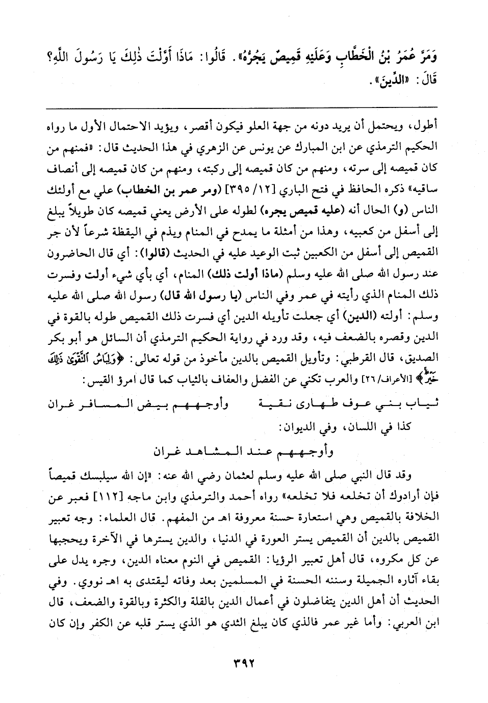وَمَرَّ عُمَرُ بْنُ الْخَطَّابِ وَعَلَيهِ قَمِيصٌ يَجُرُّهُ". قَالُوا: مَاذَا أوَّلتَ ذلِكَ يَا رَسُولَ اللهِ؟ قَال: "الدِّينَ"