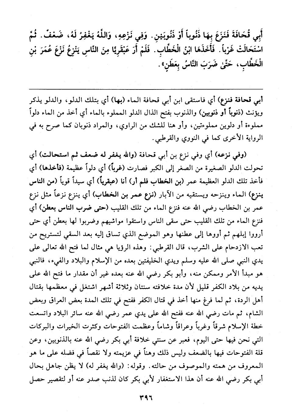 أَبِي قُحَافَةَ فَنَزَعَ بِهَا ذَنُوبًا أَو ذَنُوبَينِ. وَفِي نَزعِهِ، وَاللهُ يَغفِرُ لَهُ، ضَعْفٌ. ثُم اسْتَحَالتْ غَرْبًا. فَأَخَذَهَا ابْنُ الْخَطابِ. فَلَمْ أَرَ عَبقَرِيًّا مِنَ الناسِ يَنزعُ نَزع عُمَرَ بْنِ الْخطَابِ، حَتى ضَرَبَ الناسُ بِعَطَن"