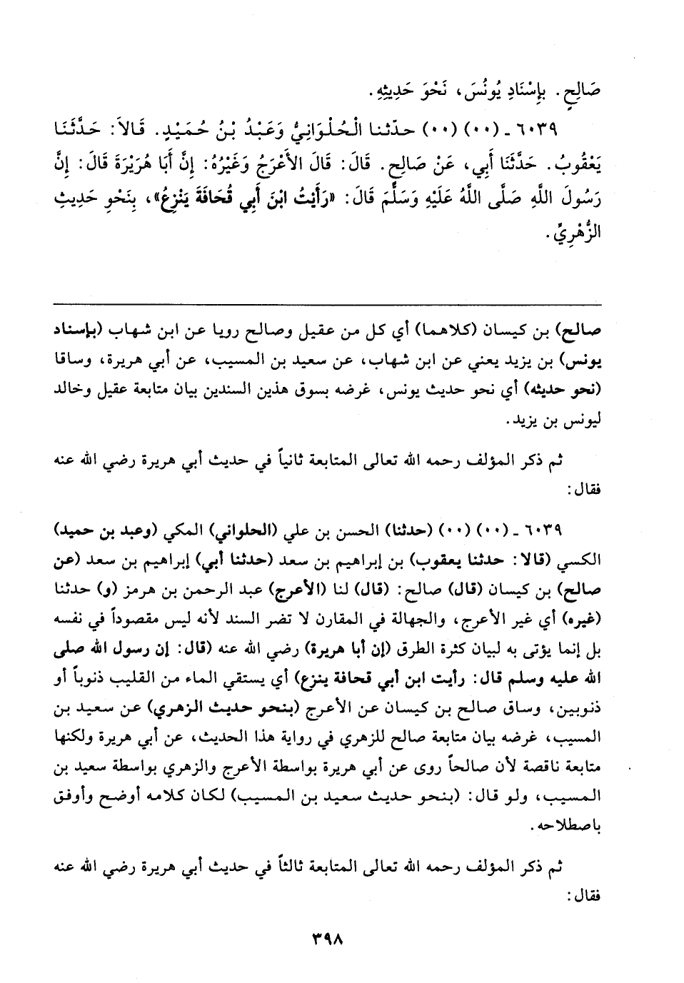 ٦٠٣٩ - (٠٠) (٠٠) (حدثنا) الحسن بن علي (الحلواني) المكي (وعبد بن حميد) الكسي (قالا: حدثنا يعقوب) بن إبراهيم بن سعد (حدثنا أبو) إبراهيم بن سعد (عن صالح) بن كيسان (قال) صالح: (قال) لنا (الأعرج) عبد الرحمن بن هرمز (و) حدثنا (غيره) أي غير الأعرج، والجهالة في المقارن لا تضر السند لأنه ليس مقصودًا في نفسه بل إنما يؤتى به لبيان كثرة الطرق (إن أبا هريرة) رضي الله عنه (قال: أن رسول الله صلى الله عليه وسلم قال: رأيت ابن أبي قحافة ينزع) أي يستقي الماء من القليب ذنوبًا أو ذنوبين، وساق صالح بن كيسان عن الأعرج (بنحو حديث الزهري) عن سعيد بن المسيب، غرضه بيان متابعة صالح للزهري في رواية هذا الحديث، عن أبي هريرة ولكنها متابعة ناقصة لأن صالحًا روى عن أبي هريرة بواسطة الأعرج والزهري بواسطة سعيد بن المسيب، ولو قال: (بنحو حديث سعيد بن المسيب) لكان كلامه أوضح وأوفق باصطلاحه.