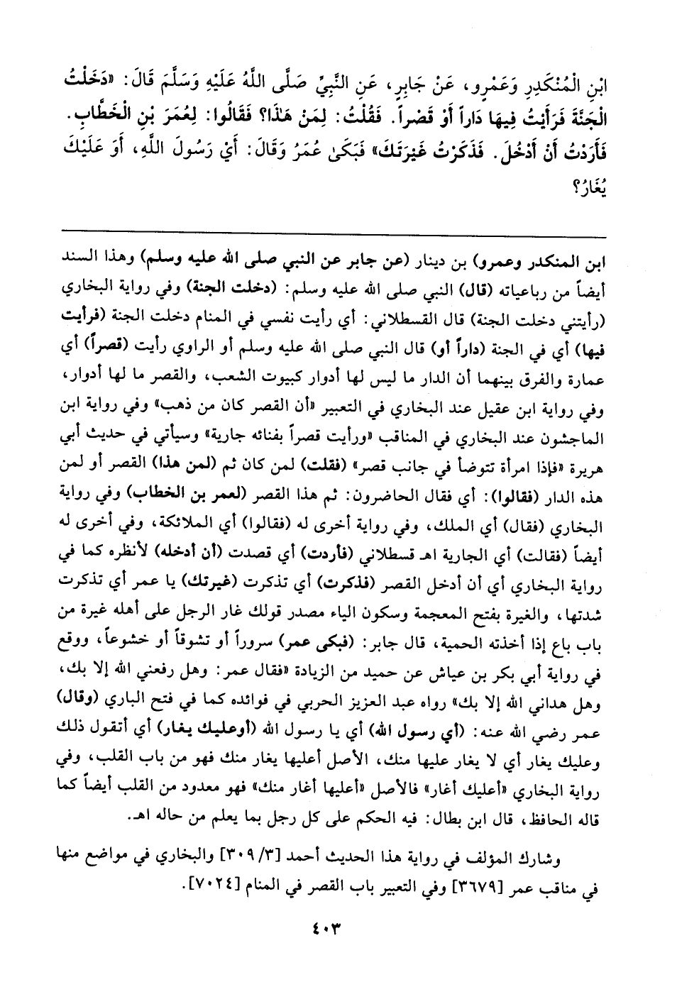 ابنِ الْمُنْكَدِرِ وَعَمْرو، عَنْ جَابِرٍ، عَنِ النَّبِيّ صَلى اللهُ عَلَيهِ وَسَلمَ قَال: "دَخَلتُ الْجنَّةَ فَرَأَيتُ فِيهَا دَارًا أَو قَصرًا. فَقُلتُ: لِمَن هَذَا؟ فَقَالُوا: لِعُمَرَ بنِ الخَطابِ. فَأَرَدتُ أَنْ أَدْخُلَ. فَذَكَرتُ غيرَتَكَ" فَبَكَى عُمَرُ وَقَال: أي رَسُولَ اللهِ، أَوَ عَلَيكَ يُغَارُ؟