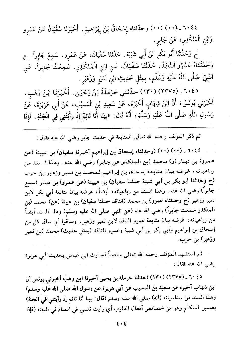 ٦٠٤٤ - (٠٠) (٠٠) (وحدثناه إسحاق بن إبراهيم أخبرنا سفيان) بن عيينة (عن عمرو) بن دينار (و) محمد (بن المنكدر عن جابر) رضي الله عنه. وهذا السند من رباعياته، غرضه بيان متابعة إسحاق بن إبراهيم لمحمد بن نمير وزهير بن حرب (ح وحدثنا أبو بكر بن أبي شيبة حدثنا سفيان) بن عيينة (عن عمرو) بن دينار (سمع جابرًا) رضي الله عنه. وهذا السند من رباعياته، أيضًا، غرضه بيان متابعة أبي بكر لابن نمير وزهير (ح وحدثناه عمرو) بن محمد (الناقد حدثنا سفيان) بن عيينة (عن) محمد (بن المنكدر سمعت جابرًا) رضي الله عنه (عن النبي صلى الله عليه وسلم) وهذا السند أيضًا من رباعياته، غرضه بيان متابعة عمرو الناقد لابن نمير وزهير، وساقوا أي ساق كل من إسحاق بن إبراهيم وأبي بكر بن أبي شيبة وعمرو الناقد (بمثل حديث) محمد (بن نمير وزهير) بن حرب.