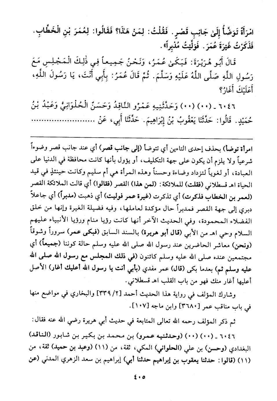 امرَأَةٌ تَوَضَّأُ إِلَى جَانِبِ قَصْرٍ. فَقُلْتُ: لِمَنْ هَذَا؟ فَقَالُوا: لِعُمَرَ بنِ الخَطابِ. فَذَكَرْتُ غَيرَةَ عُمَرَ. فَوَلَّيتُ مُدْبِرًا".