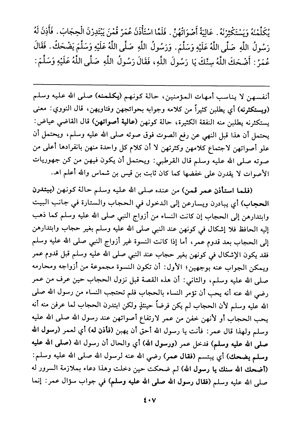 يُكَلِّمْنَهُ ويستَكثِرْنَهُ. عَالِيَةً أَصْوَاتُهُنَّ. فَلَمَّا اسْتَأذَنَ عُمَرُ قُمنَ يَبتَدِرنَ الحِجَابَ. فَأَذِنَ لَهُ رَسُولُ اللهِ صَلى اللَّهُ عَلَيهِ وَسلَّمَ. وَرَسُولُ اللهِ صَلى اللهُ عَلَيهِ وَسلَّمَ يَضْحَكُ. فَقَال عُمَرُ: أَضْحَكَ اللهُ سِنَّكَ يَا رَسُولَ اللهِ، فَقَال رَسُولُ اللهِ صَلى اللهُ عَلَيهِ وَسَلمَ: