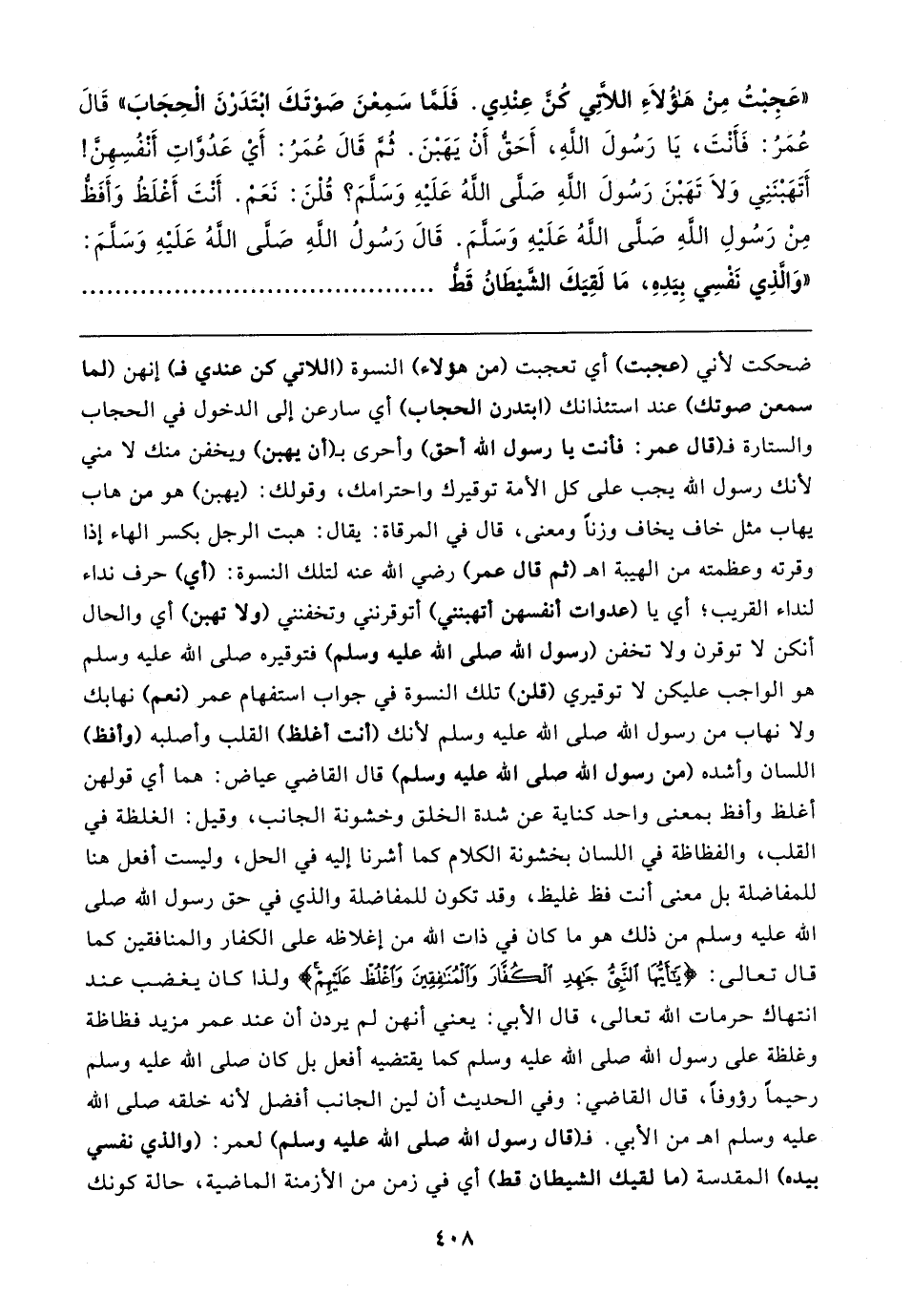 "عَجِبْتُ مِنْ هَؤُلاءِ اللَّاتي كُنَّ عِنْدِي. فَلَمَّا سَمِعْنَ صَوتَكَ ابتَدَرْنَ الحِجَابَ" قَال عُمَرُ: فَأَنْتَ، يَا رَسُولَ اللهِ، أَحَقُّ أن يَهَبْنَ. ثُم قَال عُمَرُ: أَي عَدُوَّاتِ أَنفُسِهِنَّ! أَتَهَبْنَنِي وَلَا تَهَبْنَ رَسُولَ اللهِ صَلى اللهُ عَلَيهِ وَسَلمَ؟ قُلنَ: نَعَم. أَنْتَ أَغْلَظُ وَأَفَظّ مِنْ رَسُولِ اللهِ صَلى اللهُ عَلَيهِ وَسَلمَ. قَال رَسُولُ اللهِ صَلى اللهُ عَلَيهِ وَسَلمَ: "وَالذِي نَفْسِي بِيَدِهِ، مَا لَقِيَكَ الشيطَانُ قَط